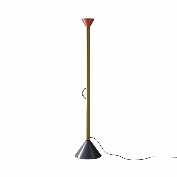 Lampada da terra Callimaco con base e diffusore realizzato in acciaio verniciato. Emblema del design avanguardistico, Callimaco è una lampada costituita da due forme coniche e uno stelo verticale. Il diffusore direziona il flusso luminoso verso l'alto e lo diffonde indirettamente nell'ambiente circostante. La lampada è a basso consumo energetico e perfettamente performante. LED 1x36W - 2700K - CRI 90 - Efficienza 92%. Disegnata da Ettore Sottsass per Artemide.