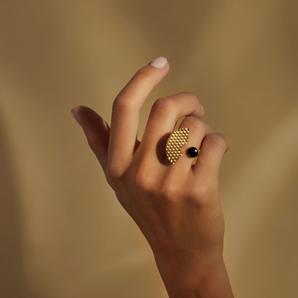 Intramontabile nei dettagli in nero e lussuoso nella finitura color oro, l'anello Edone è un simbolo di forza, femminilità e raffinatezza. Qualunque sia il tuo stile, questo anello aggiungerà brillantezza al tuo look e farà sembrare unico anche l'outfit più semplice. Sei stai pensando ad un dono prezioso per una persona cara o vuoi regalarti qualcosa di speciale e indimenticabile, l'anello Edone è proprio quello che fa per te! Dai un'occhiata agli altri splendidi accessori della linea Venusia firmata Elena Salmistrato e ordinali oggi stesso qui, su Newpop.it!