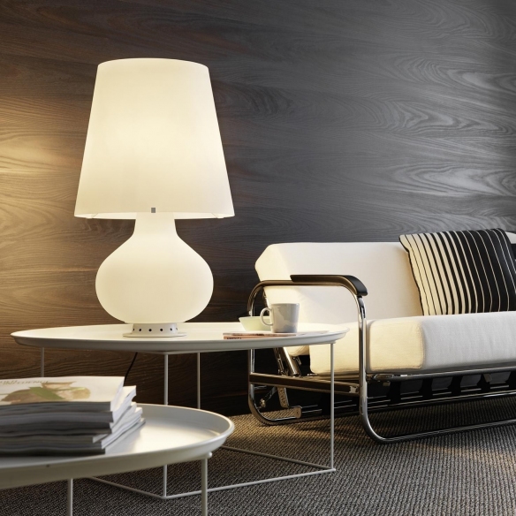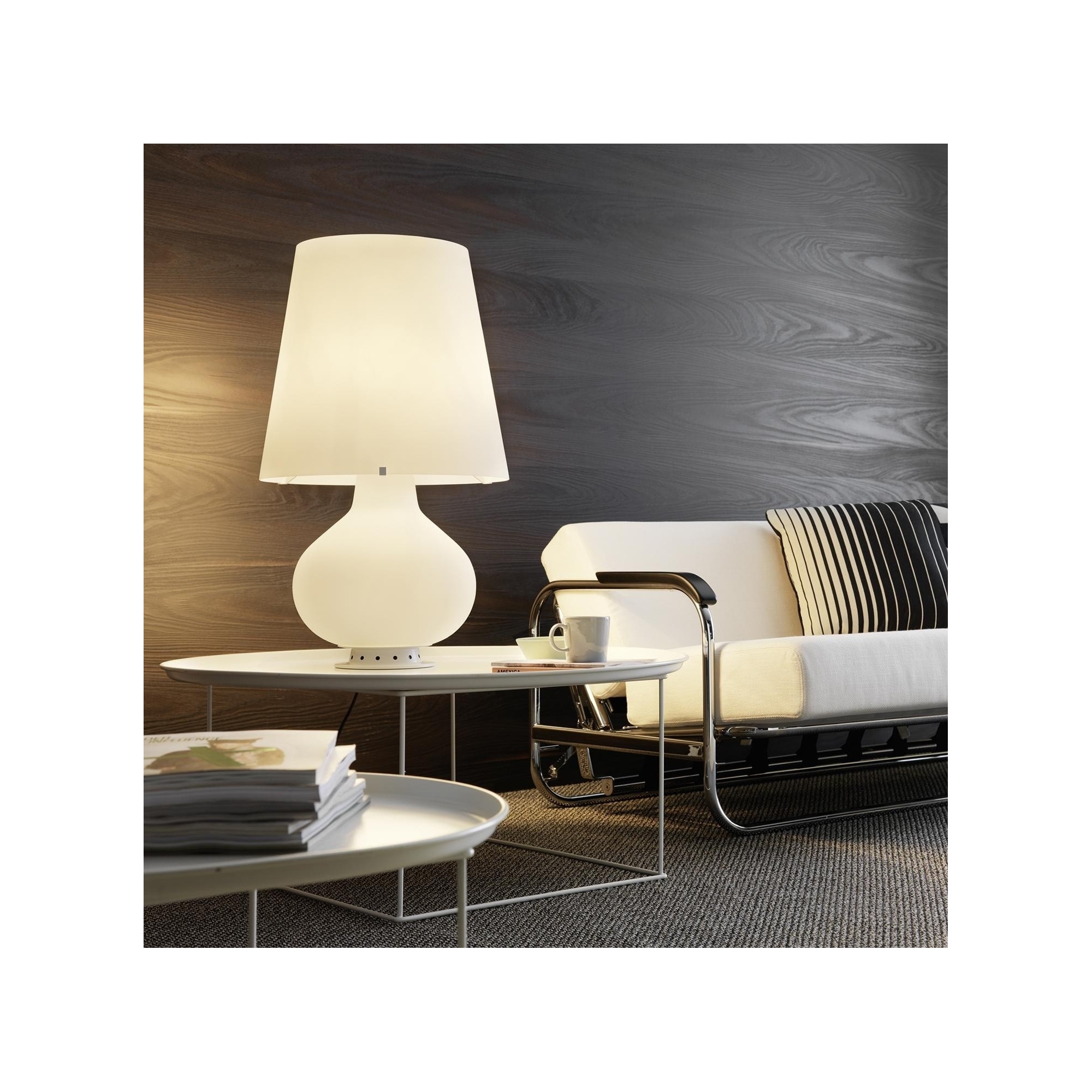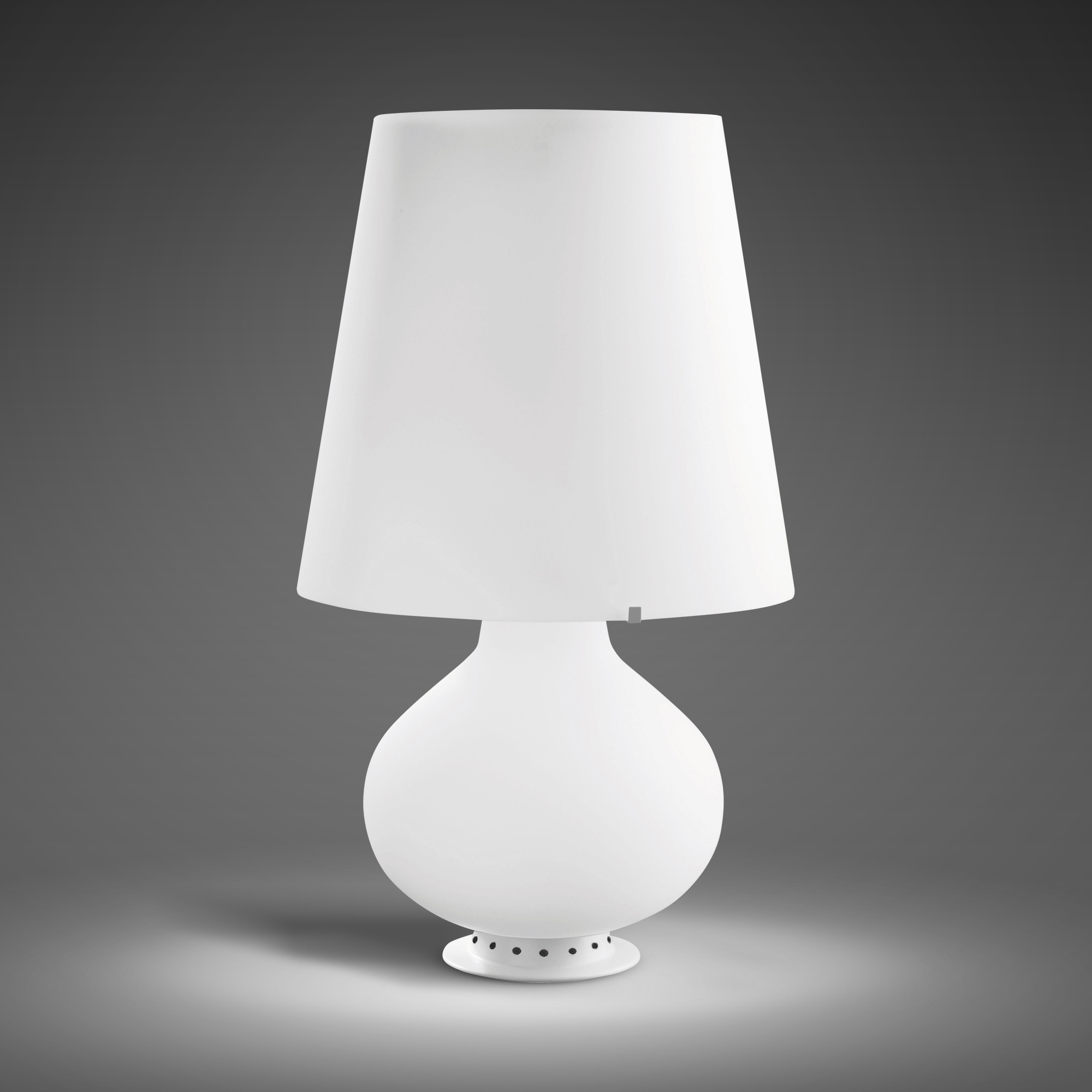 Lampada da tavolo Fontana Grande con base e diffusore realizzati in vetro satinato, montatura in metallo verniciato, spina europea a due poli e sistema di tripla accensione per illuminare la base, la parte superiore e inferiore del diffusore. La lampada è a luce indiretta e diffusa, ma non dimmerabile. Si consiglia 1x100W E27 (non inclusa). Disegnata da Max Ingrand per FontanaArte.