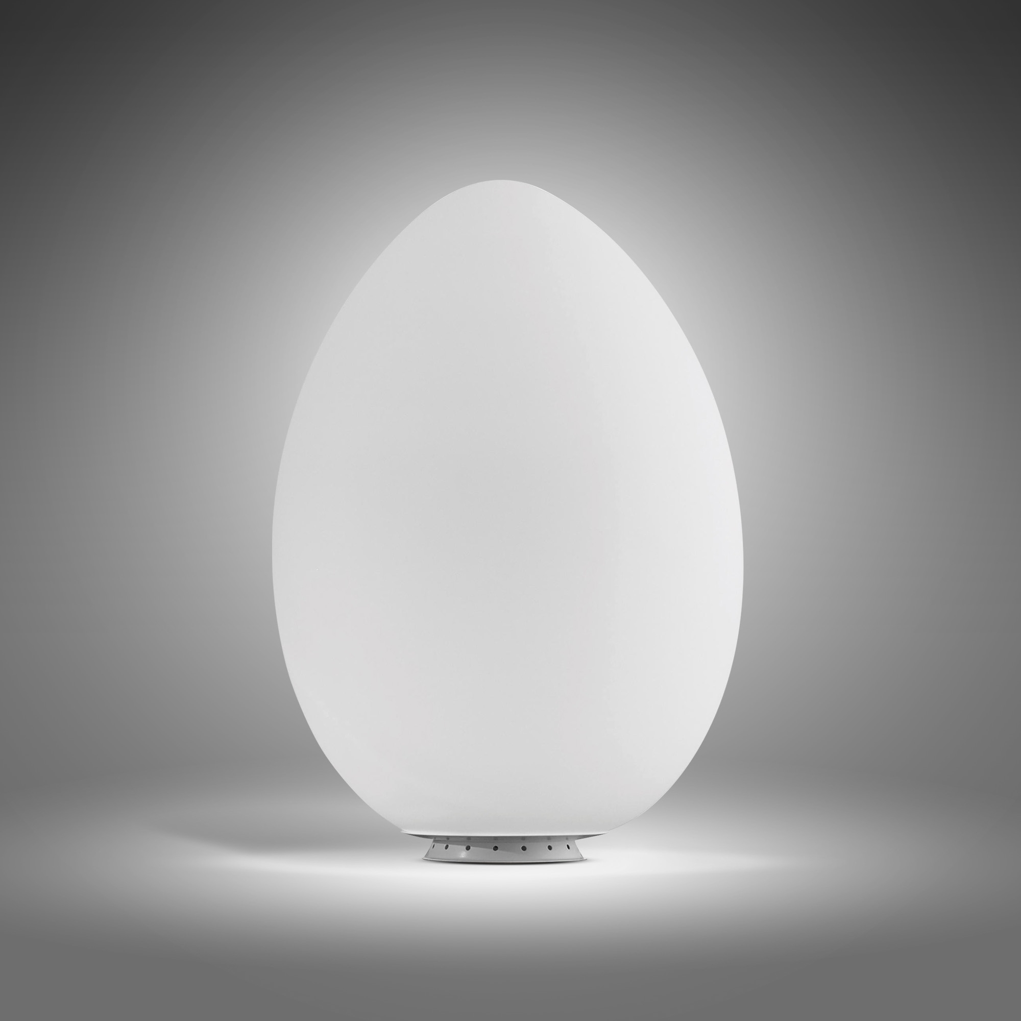 Lampada da tavolo/terra Uovo Medio realizzata in vetro soffiato satinato bianco, base in metallo verniciato bianco, spina europea 2 poli. La lampada è dimmerabile e a luce diffusa. Si consiglia LED 1x14W E27 - 2700K - 1521Lm - A++ (non inlcusa). Disegnata da Ben Swildens per FontanaArte.