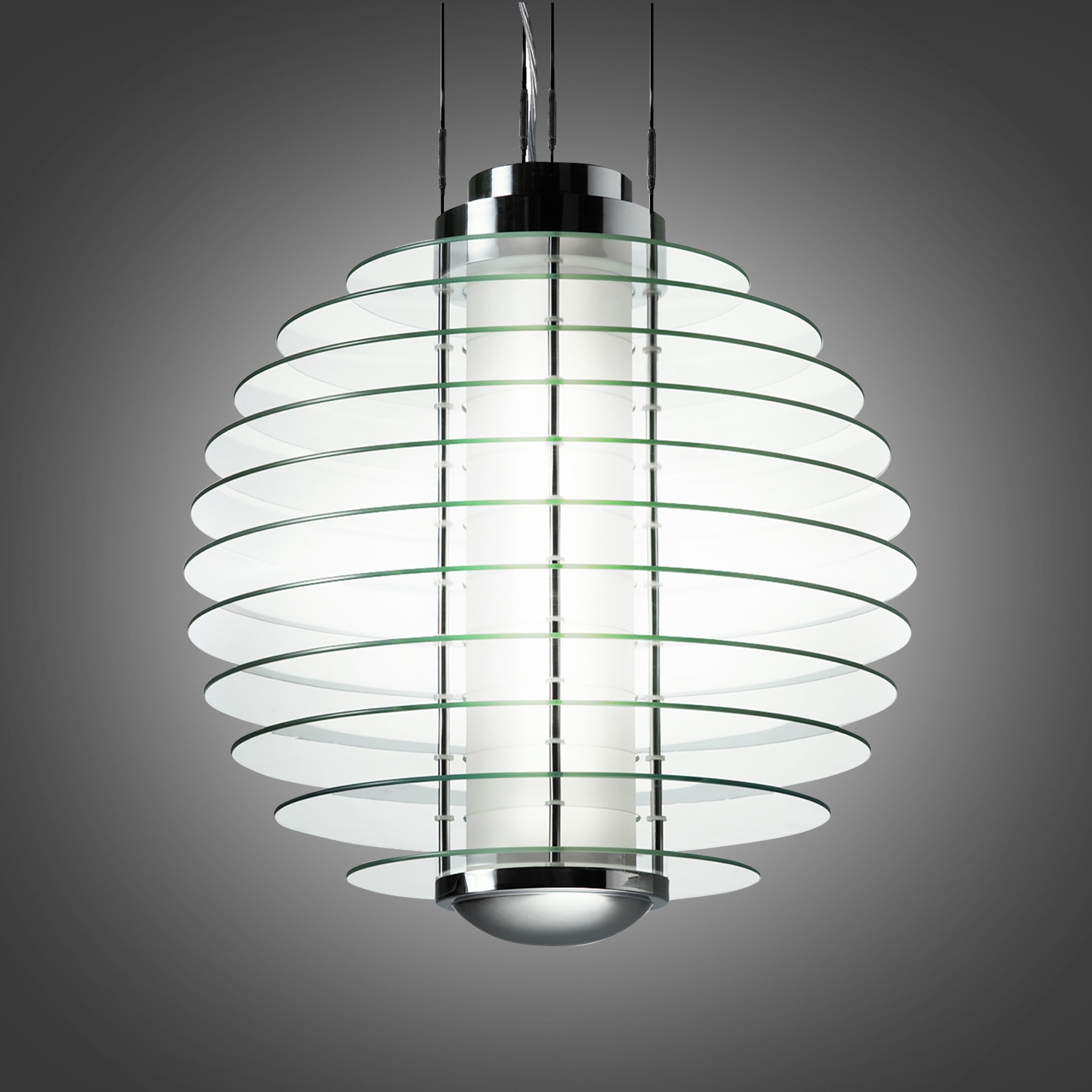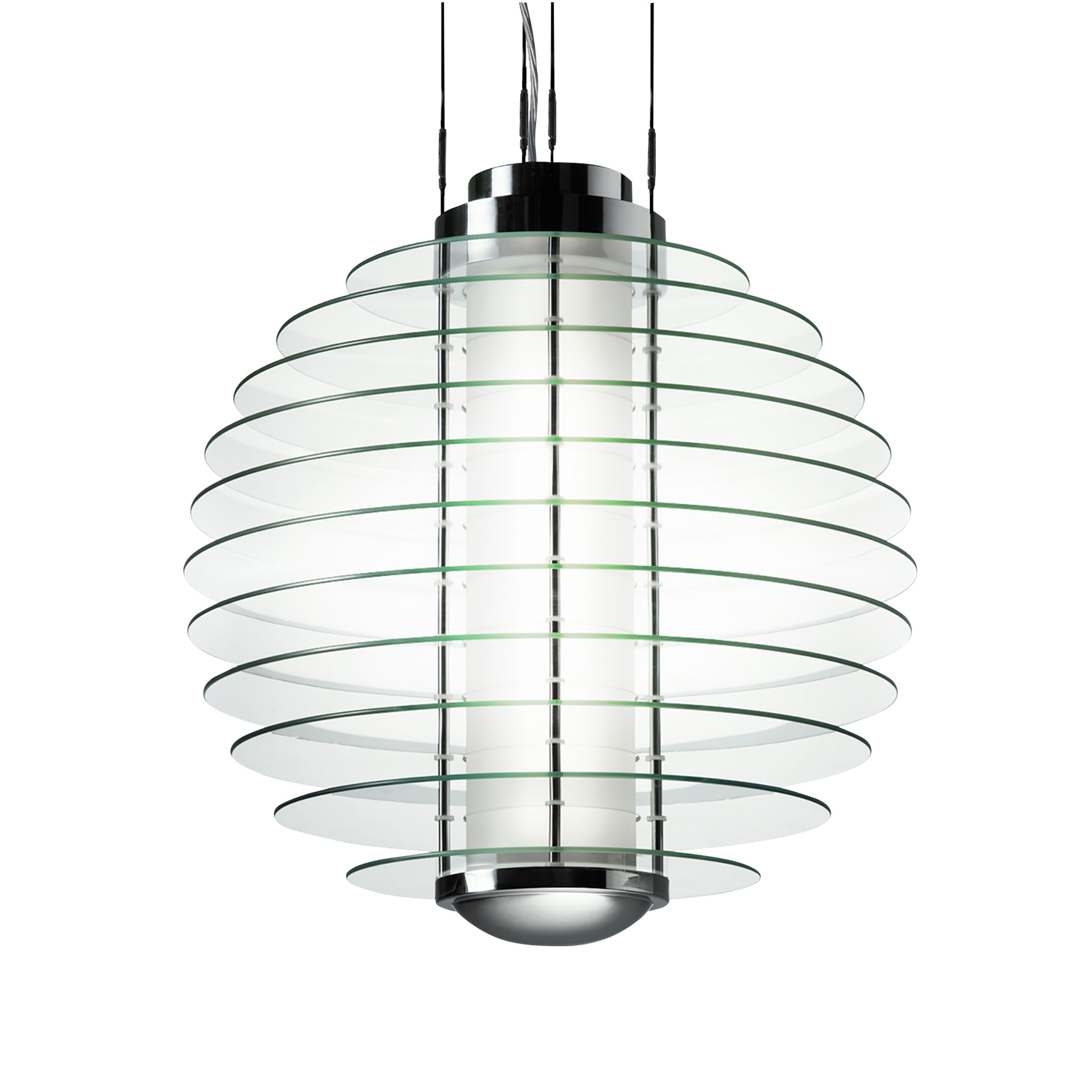 Lampada a sospensione 0024 XXL con diffusore centrale cilindrico in vetro termoresistente sabbiato, dischi in vetro temperato trasparente, montatura e rosone in ottone cromato, e cavo di sospensione in acciaio. Moderna e lineare, la lampada a sospensione 0024 XXL illumina gli spazi di una luce suggestiva. Ideale per la zona living, l'ufficio o l'ingresso, la lampada è dimmerabile tramite sistema DALI. Sorgente luminosa 4x54W G5 (non inclusa). Disegnata da Giò Ponti per Fontana Arte.
