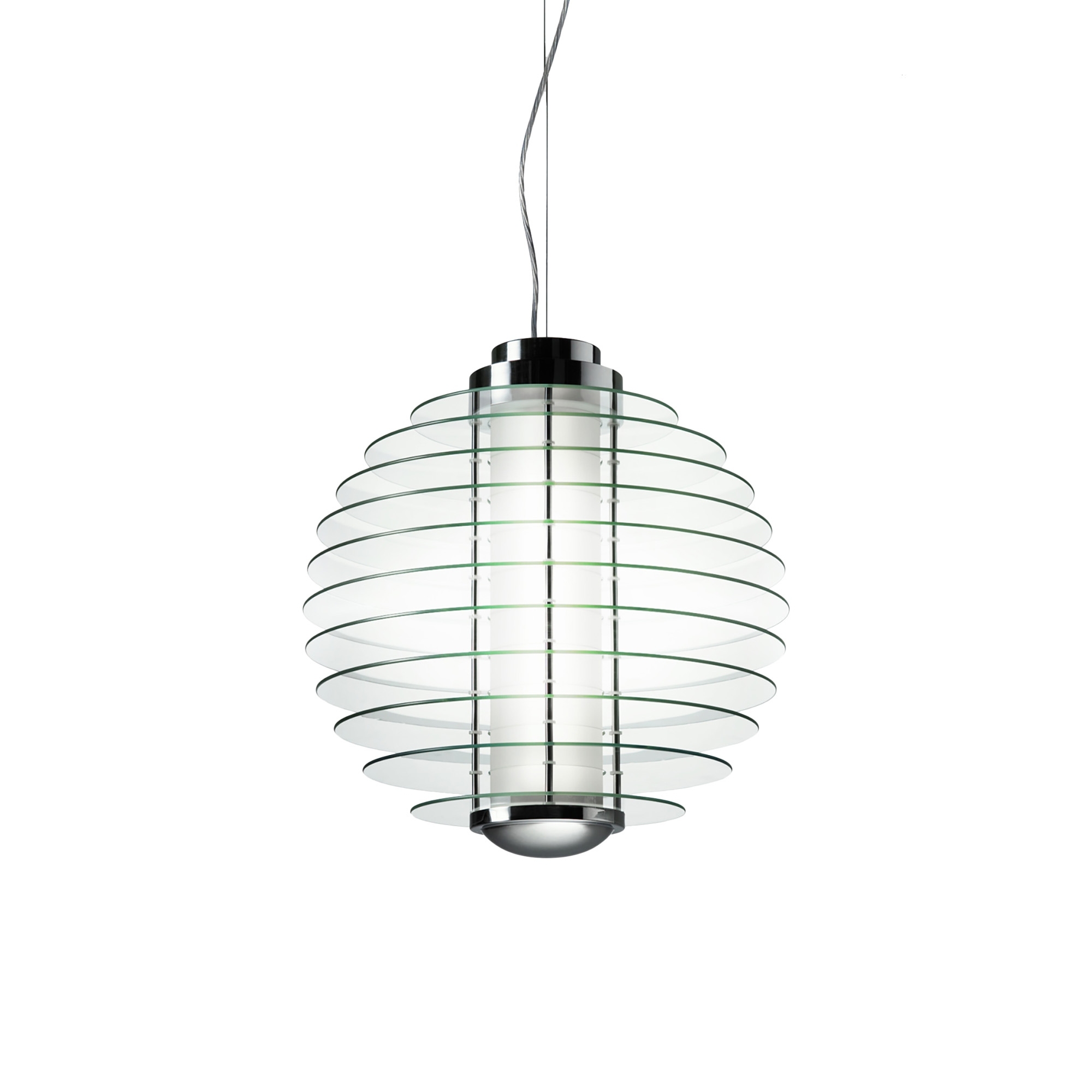 Lampada a sospensione 0024 con diffusore centrale cilindrico in vetro termoresistente sabbiato, dischi in vetro temperato trasparente, montatura e rosone in ottone cromato, e cavo di sospensione in acciaio. Moderna e lineare, la lampada a sospensione 0024 illumina gli spazi di una luce suggestiva. Ideale per la zona living, l'ufficio o l'ingresso. Sorgente luminosa 2x36W 2G11 (non inclusa). Disegnata da Giò Ponti per Fontana Arte.