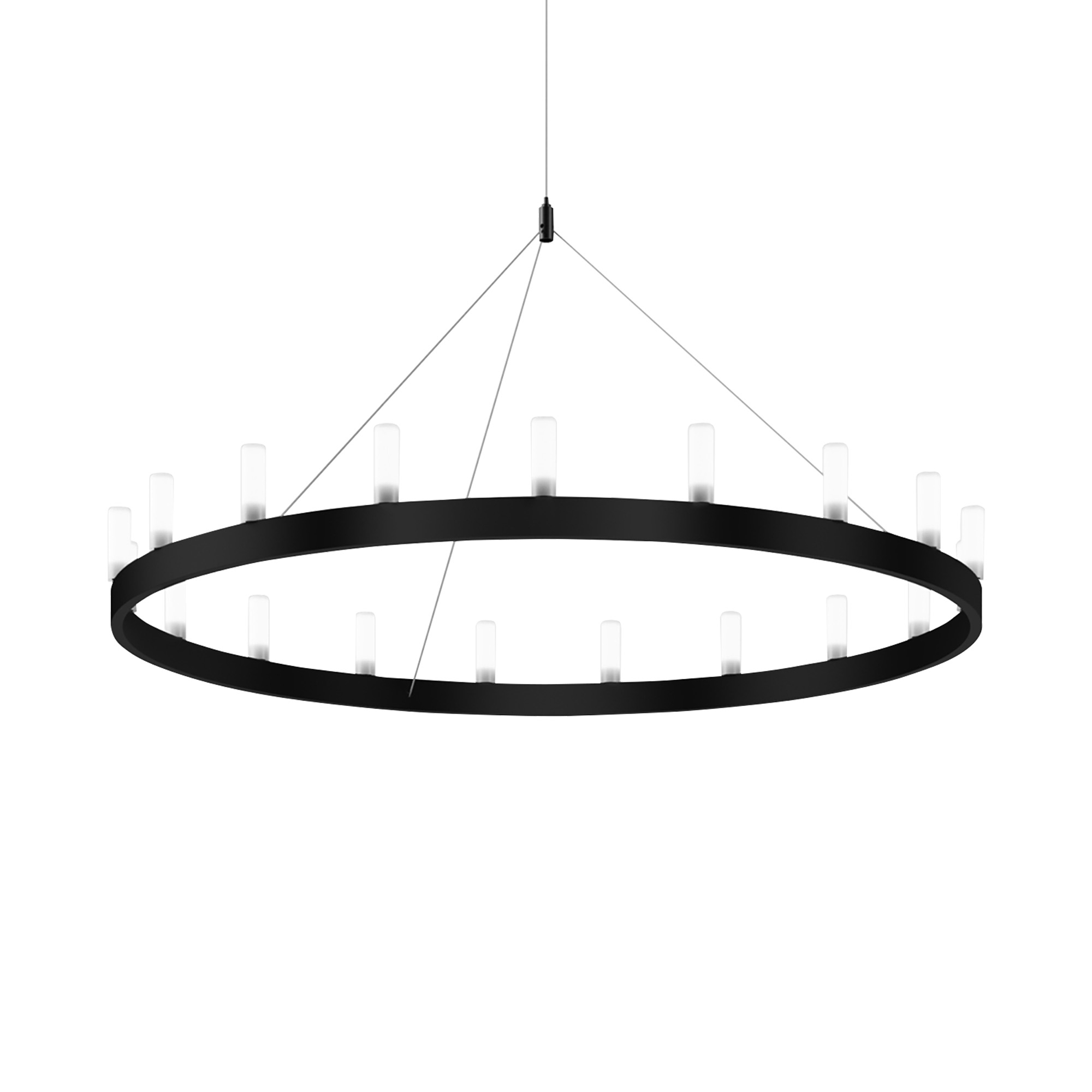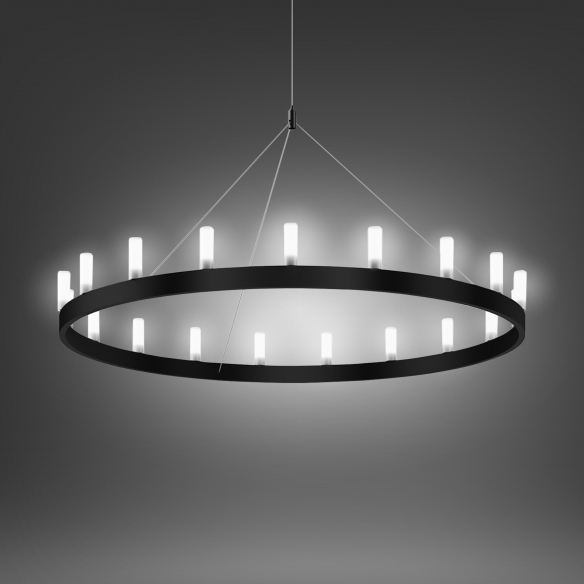 Lampada a sospensione Chandelier media con diffusori in vetro borosilicato sabbiato, montatura e rosone in metallo verniciato, e cavi di sospensione in acciaio. Incantevole e maestosa, la lampada a sospensione Chandelier a luce indiretta porta un tocco di fascino vintage in ogni ambiente. Perfetta in ampi open space, la lampada è dimmerabile. 19x40W E14 (non incluse). Disegnata da David Chipperfield per Fontana Arte.
