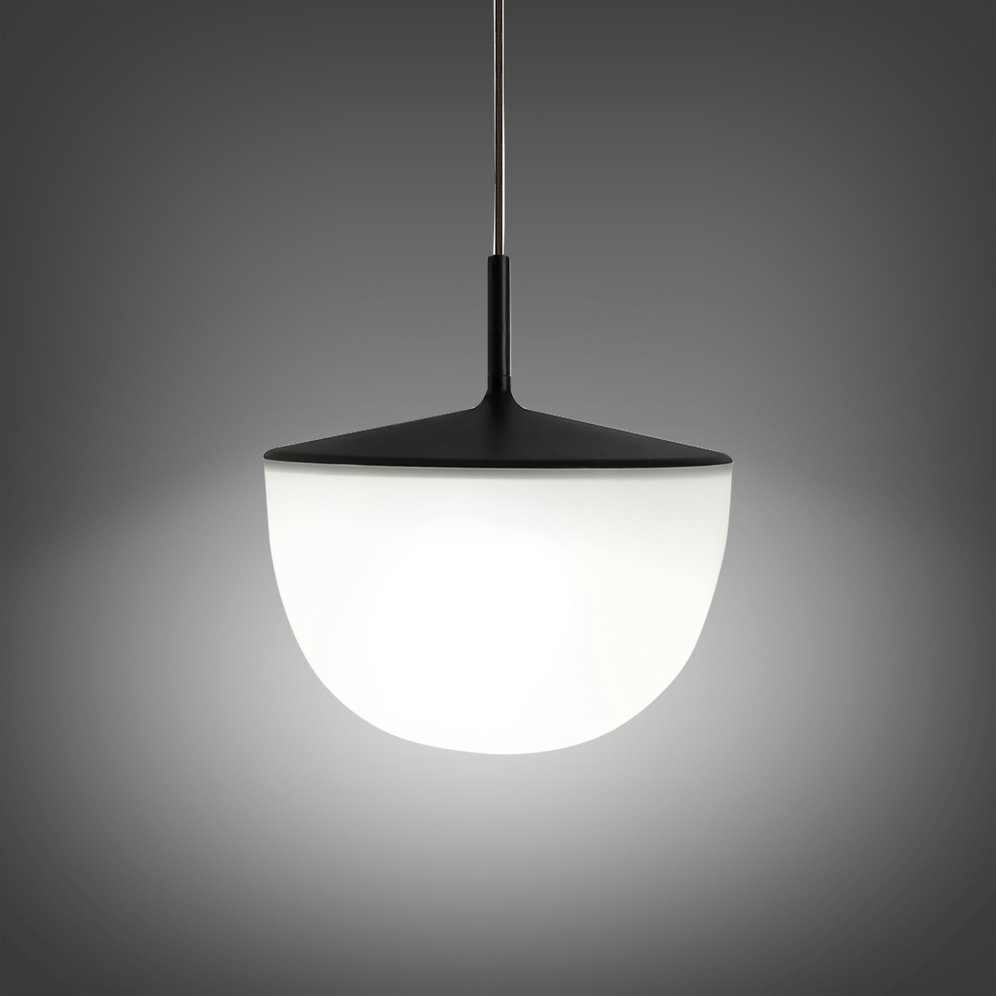 Lampada a sospensione Cheshire a luce indiretta con diffusore superiore in policarbonato verniciato, diffusore inferiore in policarbonato opalino, montatura in metallo verniciato, cavo di alimentazione in tessuto nero e rosone in policarbonato verniciato. Perfetta in moderne zone living. 3x23W E27 (non incluse). Disegnata da GamFratesi per Fontana Arte.