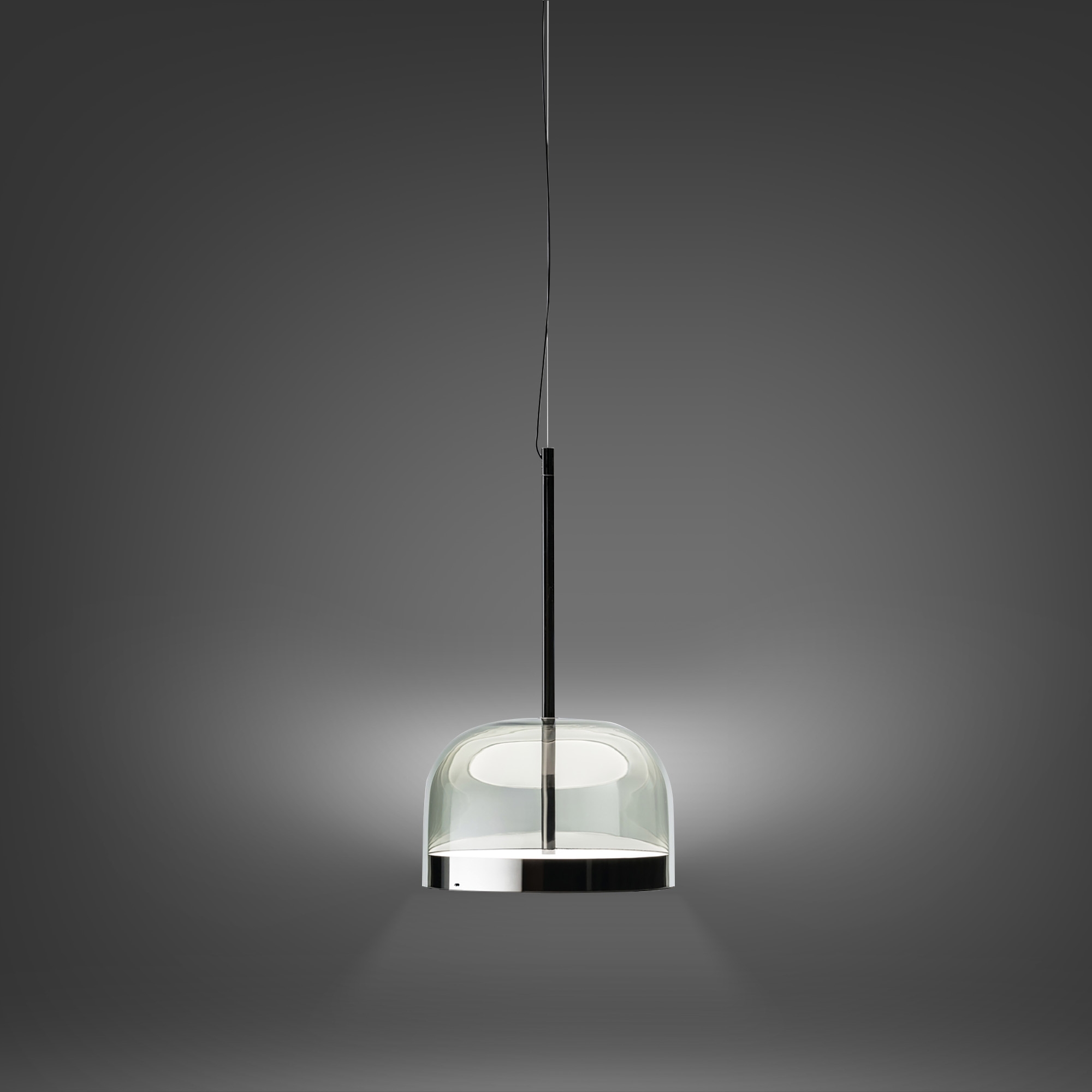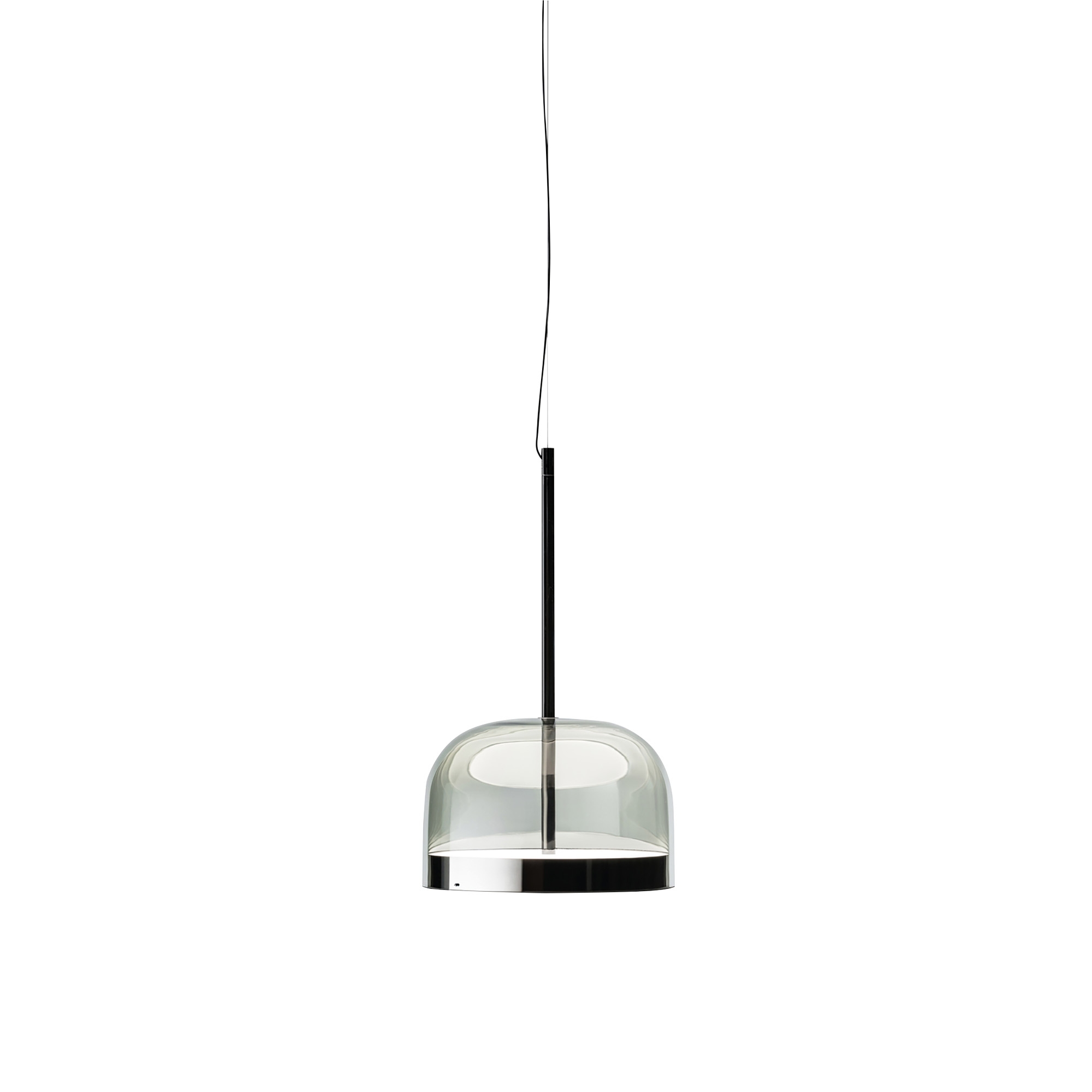 Lampada a sospensione Equatore piccola a luce diffusa dimmerabile con diffusore in vetro trasparente, montatura in metallo galvanizzato, cavo di sospensione in acciaio, rosone in metallo verniciato e due dischi in policarbonato sovrapposti. Disponibile in Rame e Nero, la lampada a sospensione Equatore è straordinaria in ambienti moderni. LED 25W 2700K - CRI>90 - 2900lm. Disegnata da Gabriele e Oscar Buratti per Fontana Arte.