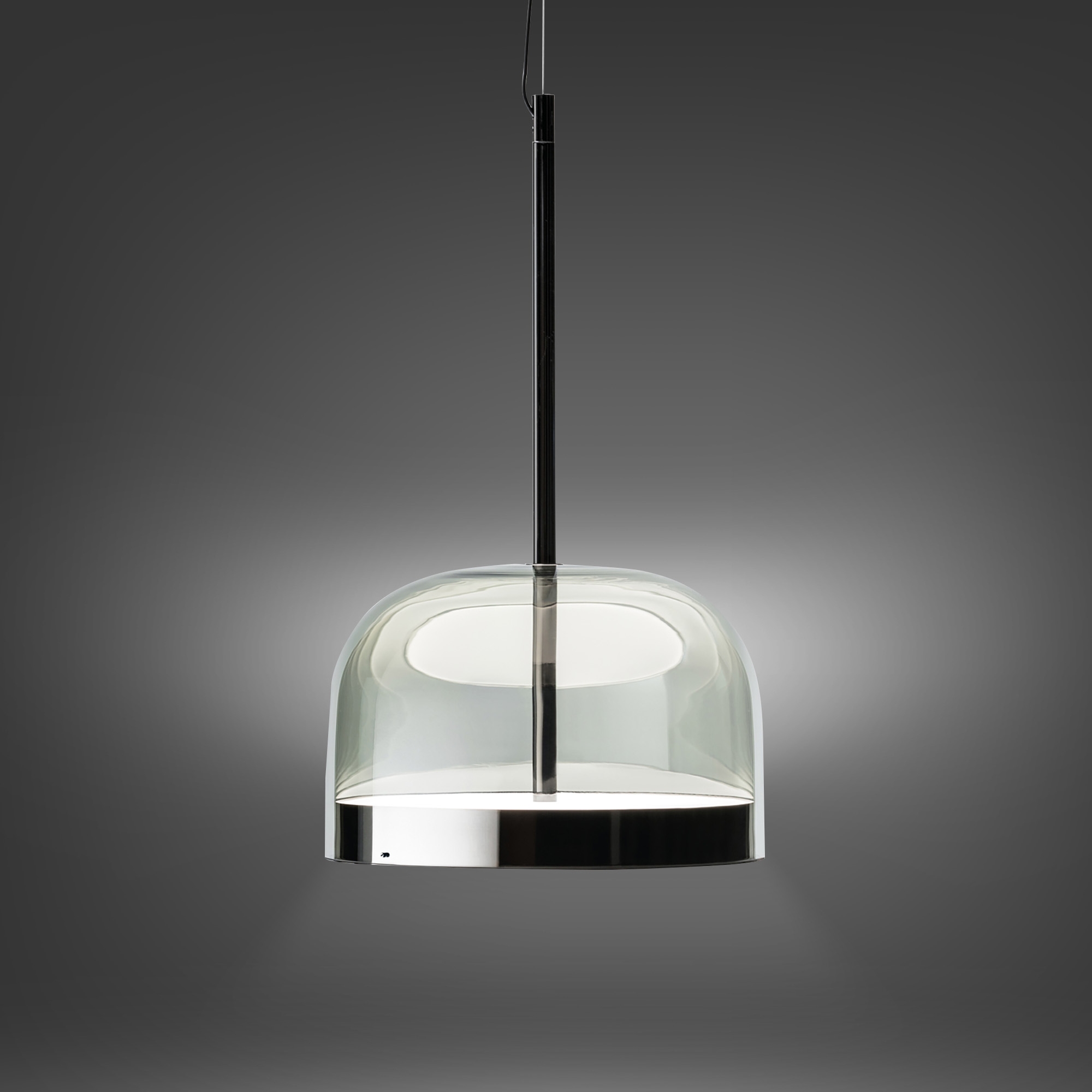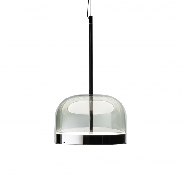 Lampada a sospensione Equatore grande a luce diffusa dimmerabile con diffusore in vetro trasparente, montatura in metallo galvanizzato, cavo di sospensione in acciaio, rosone in metallo verniciato e due dischi in policarbonato sovrapposti. Disponibile in Rame e Nero, la lampada a sospensione Equatore è straordinaria in ambienti moderni. LED 60W 2700K - CRI>90 - 6600lm. Disegnata da Gabriele e Oscar Buratti per Fontana Arte.