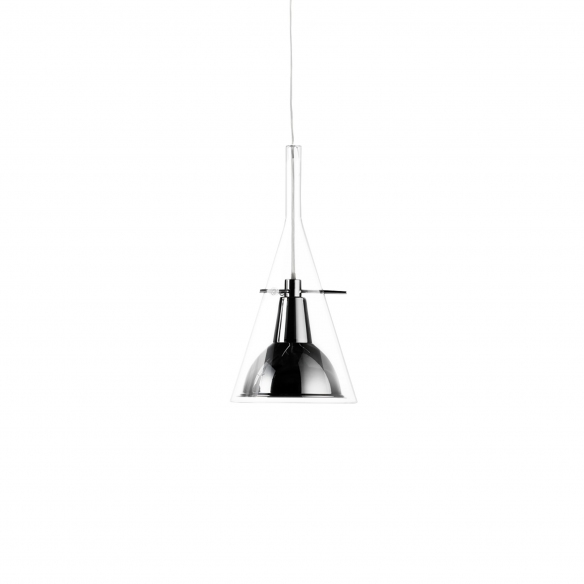 Lampada a sospensione Flûte piccola in vetro borosilicato trasparente, riflettore in metallo galvanizzato, cavo di alimentazione trasparente, rosone in policarbonato cromato. Disponibile in Cromo, Nero lucido, Ottone e Rame, la lampada Flûte è a luce diretta e dimmerabile. Perfetta in moderni open space. LED 10W - 2700K - CRI 80, 1250lm. Disegnata da Franco Raggi per Fontana Arte.