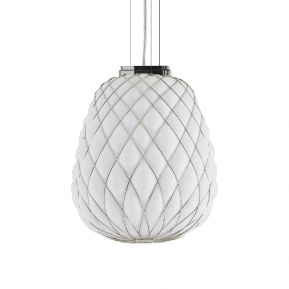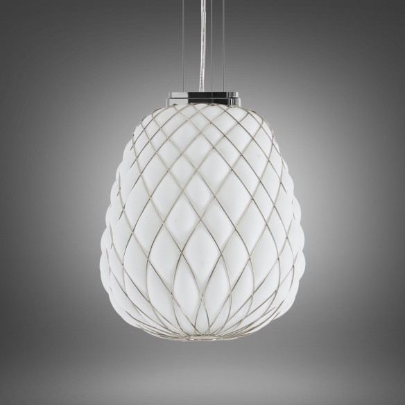Lampada a sospensione Pinecone grande con diffusore realizzato in vetro soffiato acidato, reticolo e base in metallo, rosone in metallo verniciato, cavo di alimentazione trasparente e cavi di sospensione in acciaio. Come una pigna graziosa, la lampada a sospensione Pinecone diffonde una piacevole luce diffusa nell'ambiente. Ideale per la zona living, la lampada è dimmerabile. Sorgente luminosa 1x116W E27 (non inclusa). Disegnata da Paola Navone per Fontana Arte.