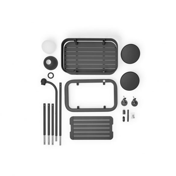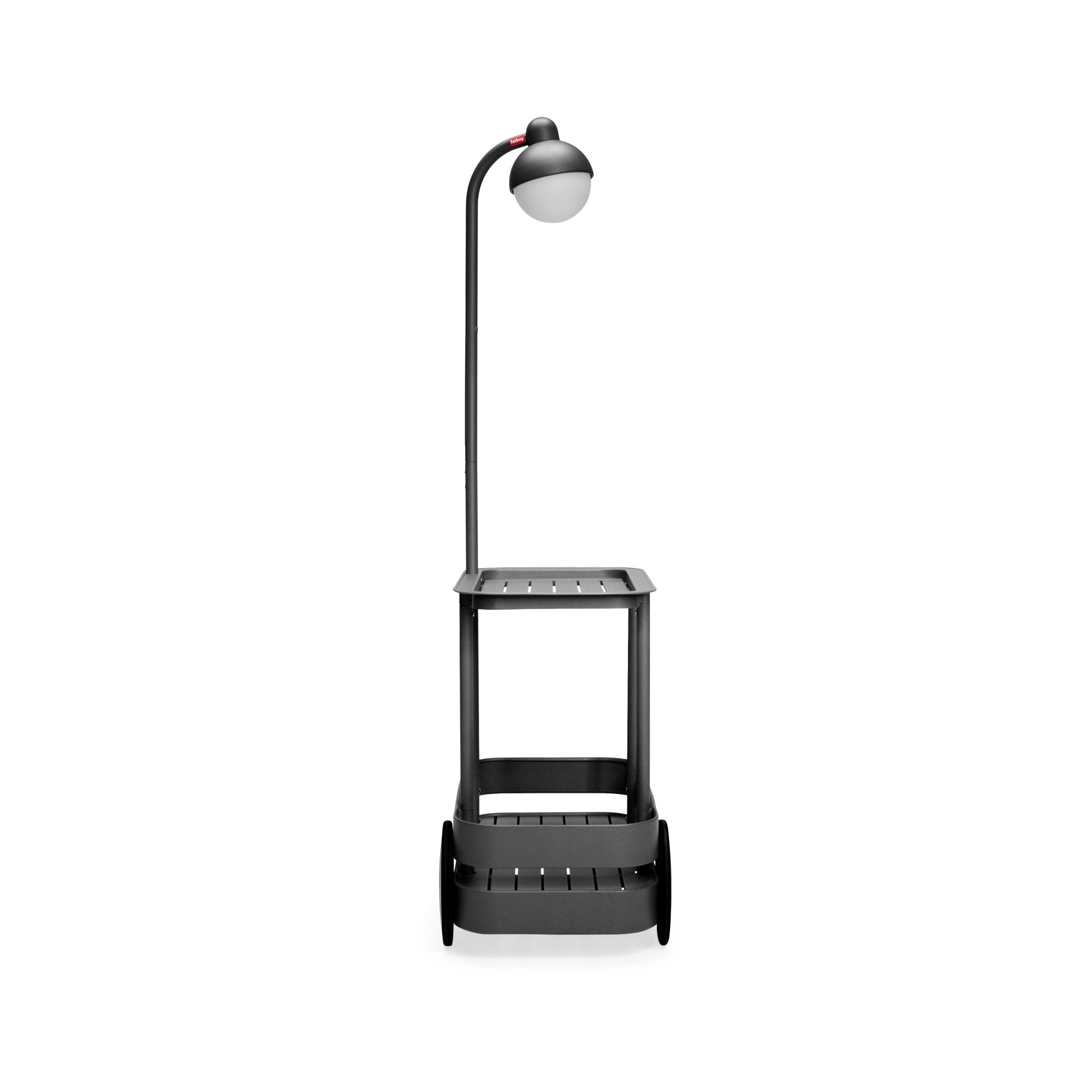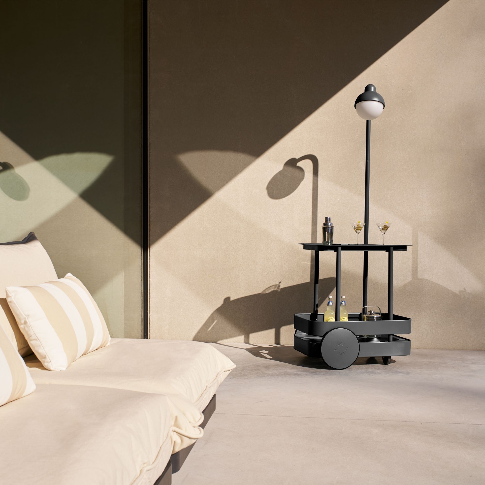 Carrello Jolly Trolley realizzato in alluminio verniciato a polvere con ruote, supporti vassoio e interruttore on/off in elastomero, ruote anteriori in polipropilene, poliuretano e acciaio, e lampada LED a batteria dimmerabile e ricaricabile tramite cavo USB-C e diffusore in HDPE. Disponibile in Dark Sage, Light Grey e Tangerine, il carrello Jolly Trolley è il tuo piccolo aiutante in casa, con due ampi ripiani per riporre qualunque cosa tu voglia ed è adatto sia ad uso interno che esterno. Progettato e realizzato da Fatboy.