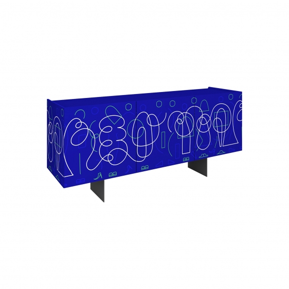 Madia a tre ante appartenente alla linea Blue Doodle realizzata in legno laccato con base in metallo con finitura grigio grafite, ante in MDF e grafica in stampa digitale con vernice protettiva all’acqua. Ideale per arredare una zona living moderna e spensierata, la madia è dotata di comodi ripiani e perfetta come pezzo basso su cui esporre vasi decorativi o oggetti vari. Disegnata da Jonathan Calugi per Pictoom.