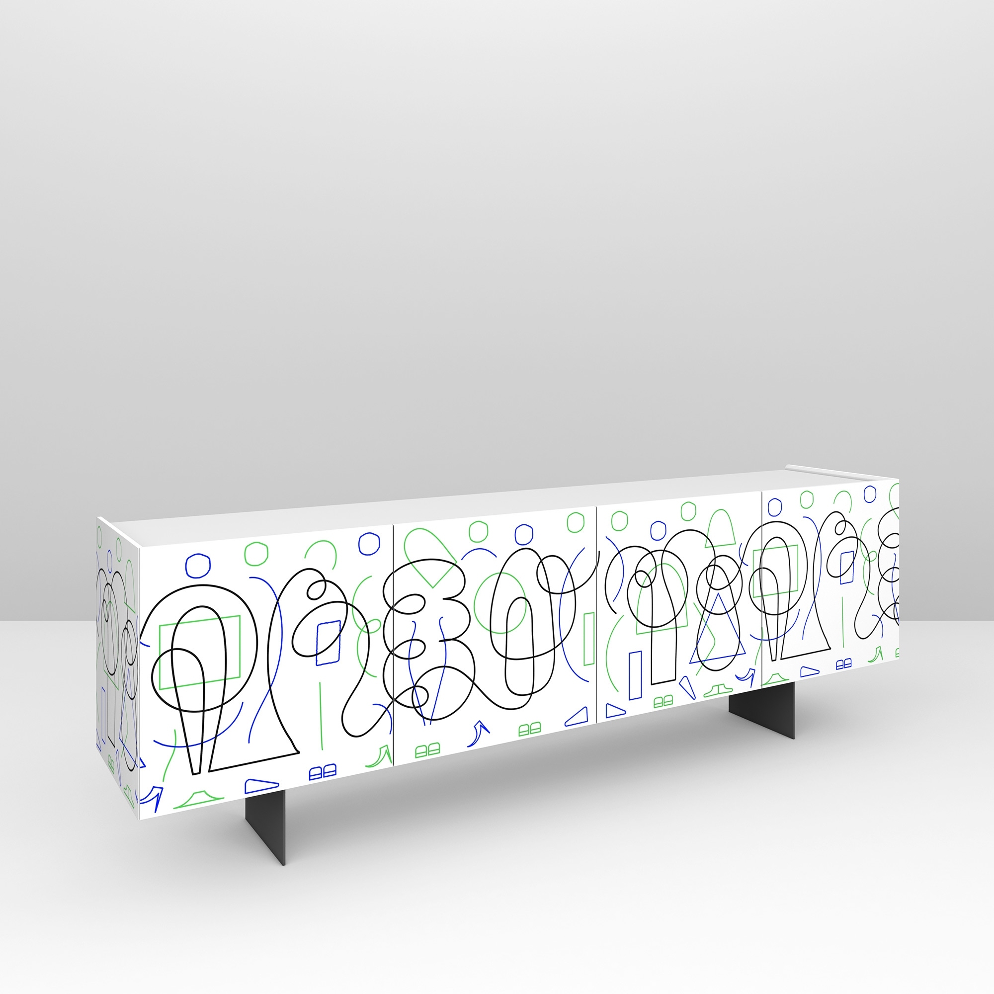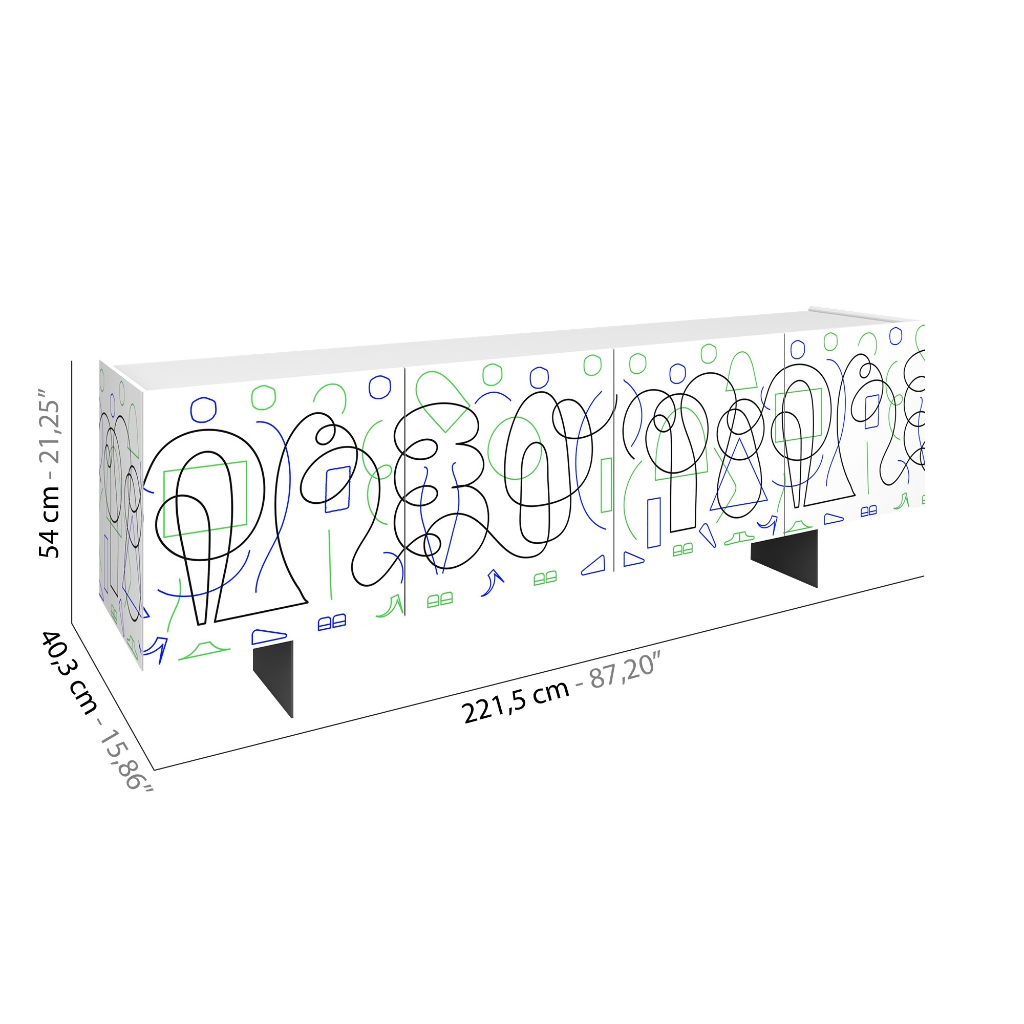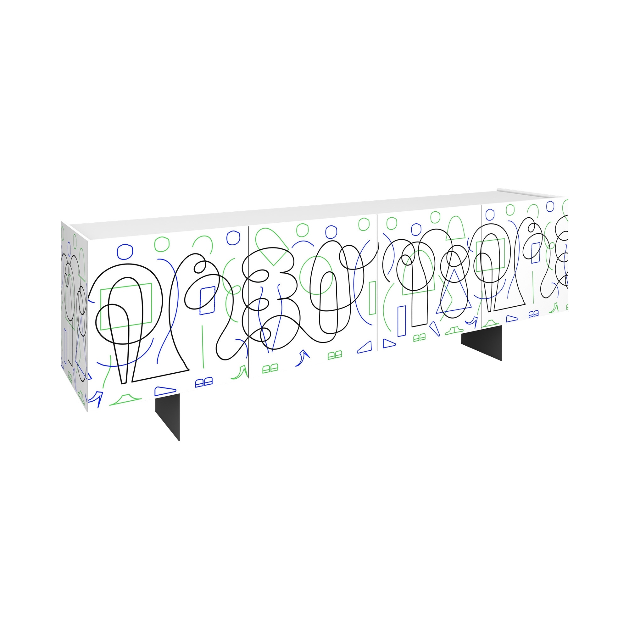Madia a quattro ante appartenente alla linea White Doodle realizzata in legno laccato con base in metallo con finitura grigio grafite, ante in MDF e grafica in stampa digitale con vernice protettiva all’acqua. Ideale per arredare una zona living moderna e spensierata, la madia è dotata di comodi ripiani e perfetta come pezzo basso su cui esporre vasi decorativi o oggetti vari. Disegnata da Jonathan Calugi per Pictoom.