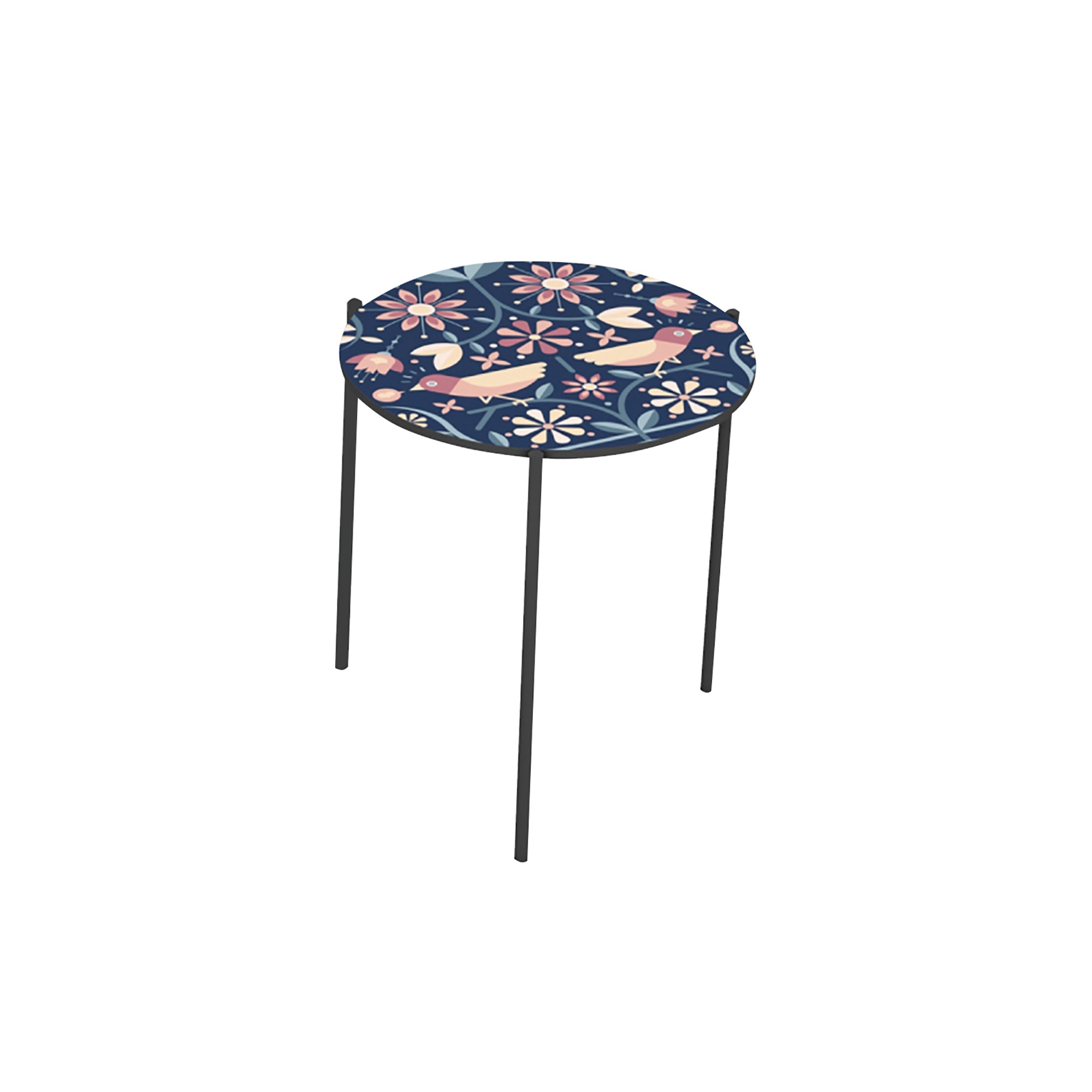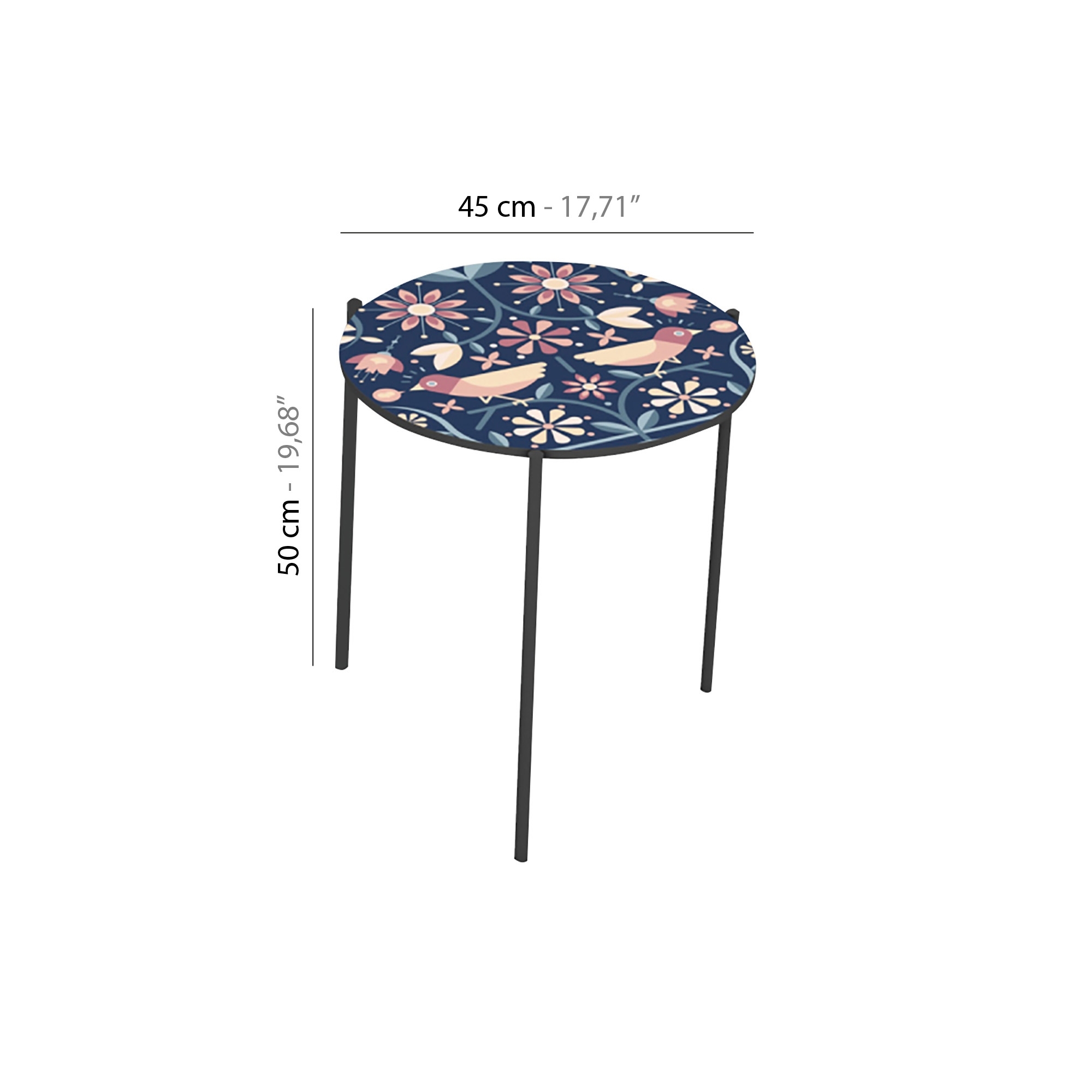 Tavolino dal diametro di 45 cm appartenente alla linea Modern Hippie con struttura in metallo verniciato grigio grafite, piano in MDF e grafica in stampa digitale con vernice protettiva all’acqua. Ideale per ridisegnare il tuo salotto, il tavolino si abbina in modo impeccabile alla madia della stessa linea per un arredamento fresco e giocoso. Disegnato da Francesco Poroli per Pictoom.