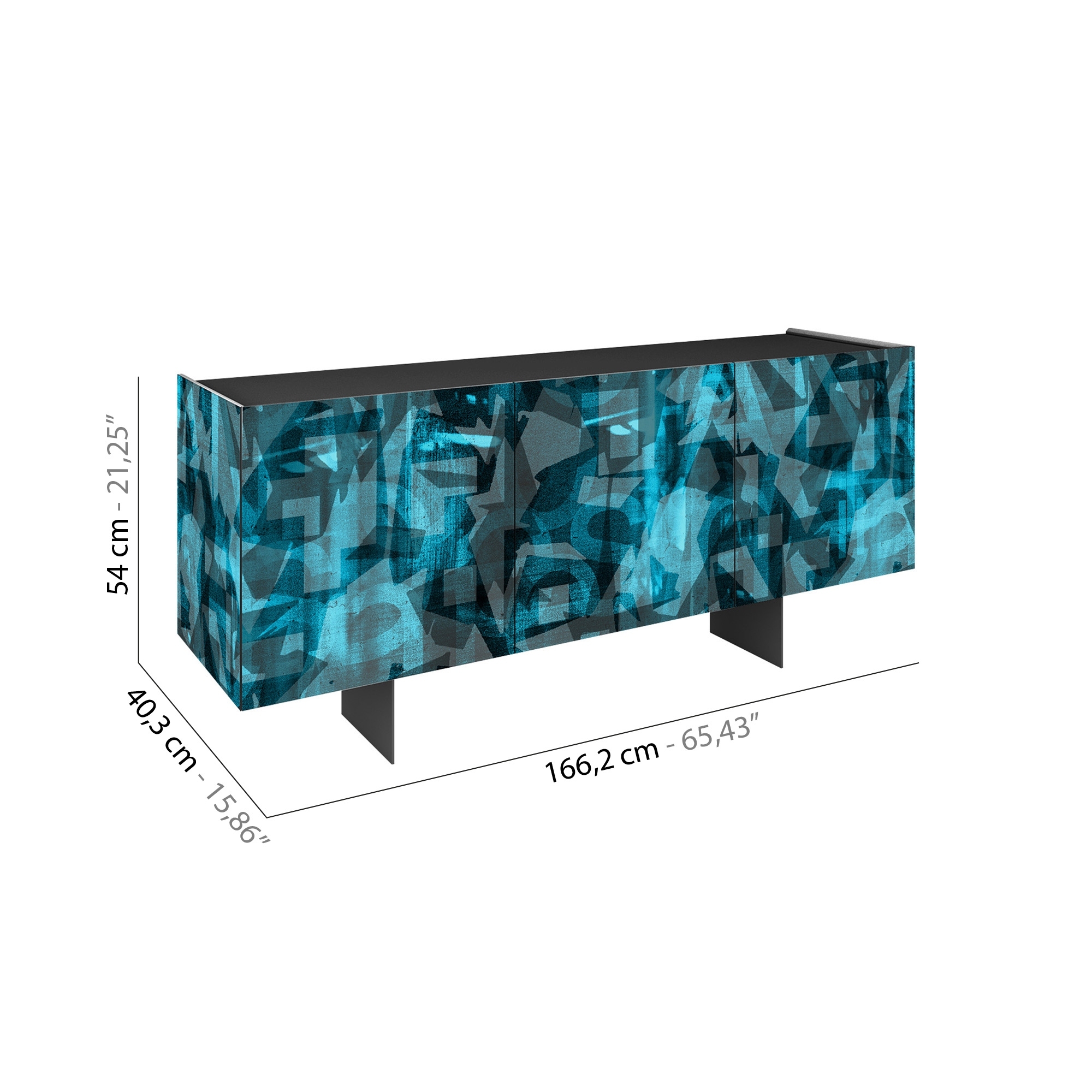 Madia a tre ante appartenente alla linea Lettering realizzata in legno laccato con base in metallo con finitura grigio grafite, ante in MDF e grafica in stampa digitale con vernice protettiva all’acqua. Ideale per arredare una zona living moderna e spensierata, la madia è dotata di comodi ripiani e perfetta come pezzo basso su cui esporre vasi decorativi o oggetti vari. Disegnata da Tiziano Sartori per Pictoom.