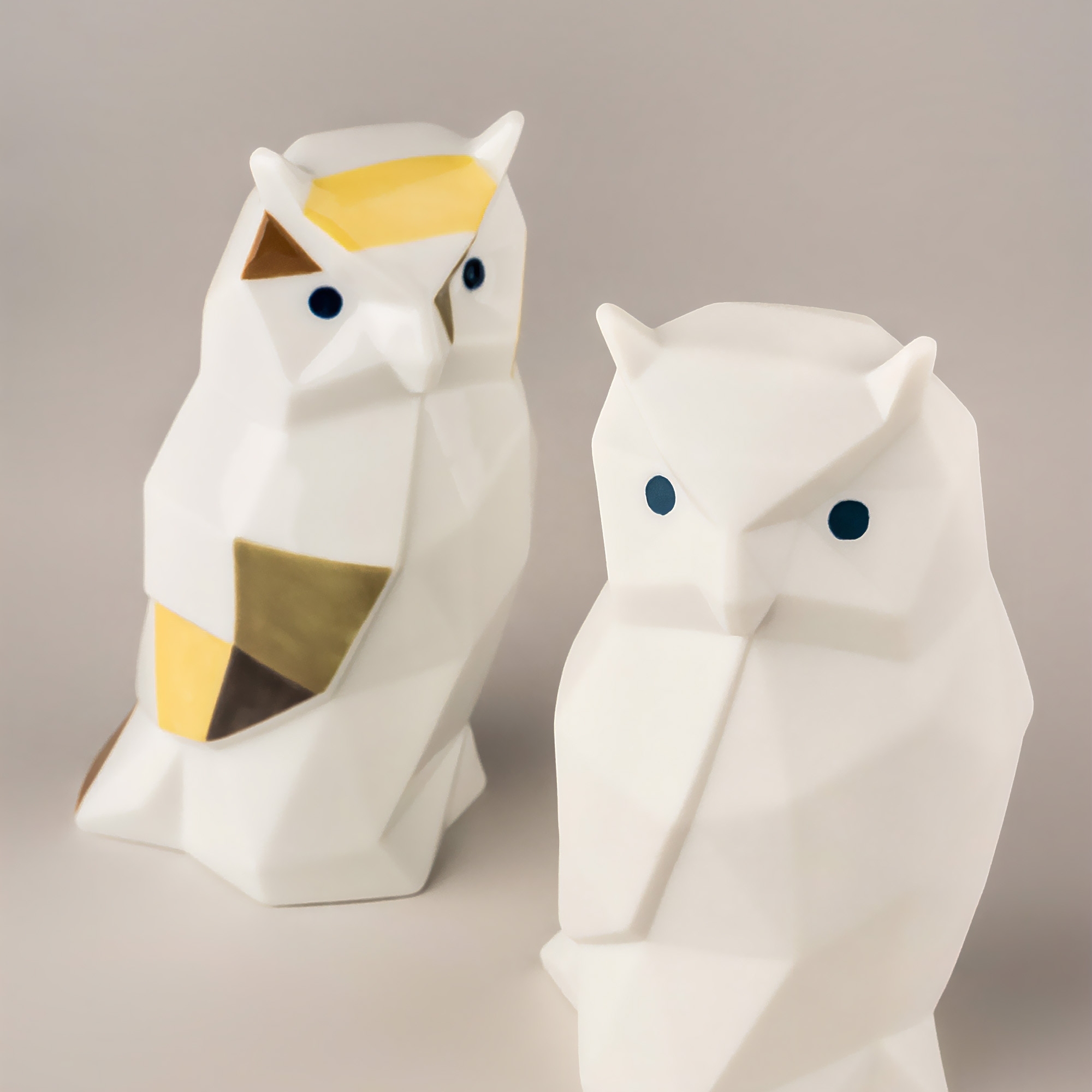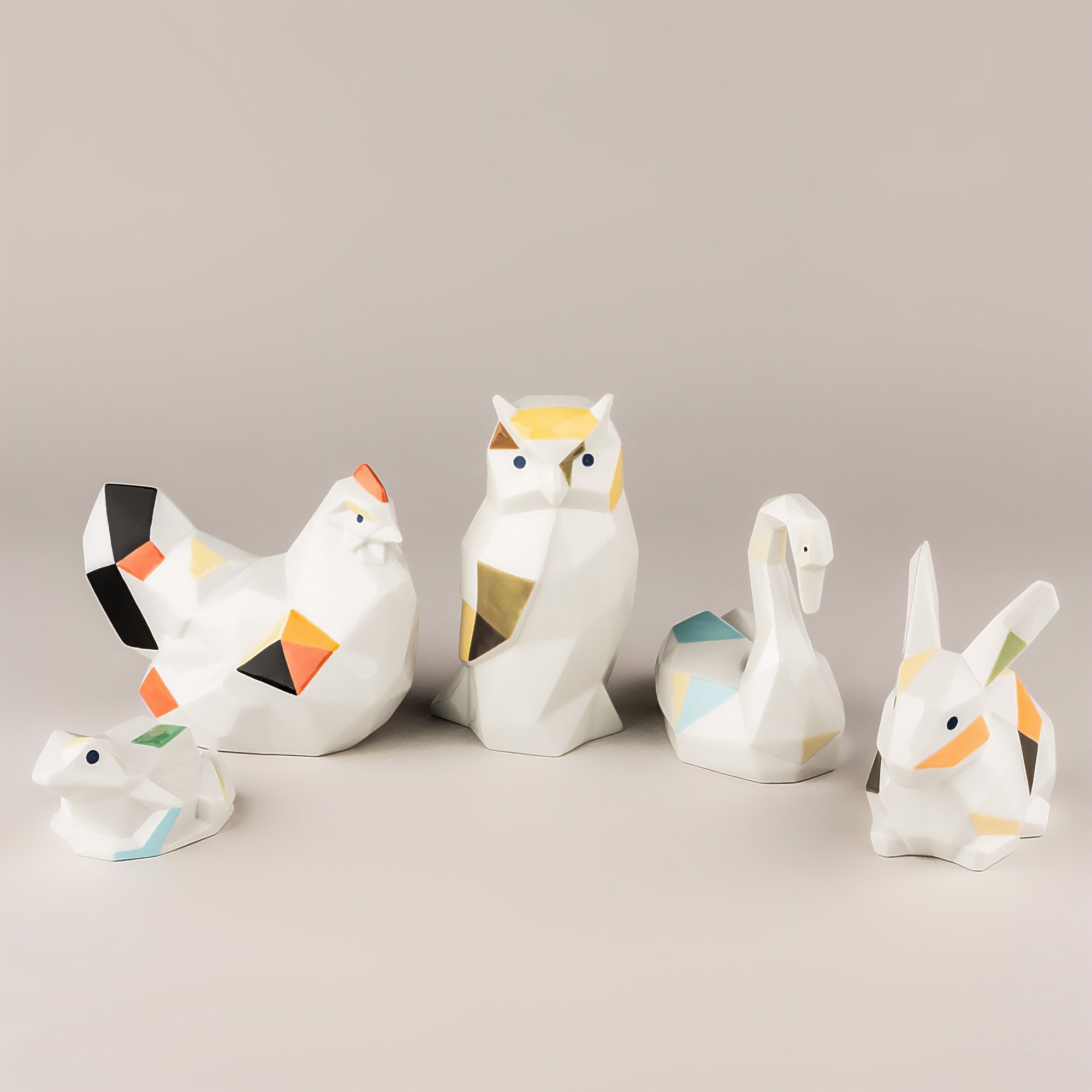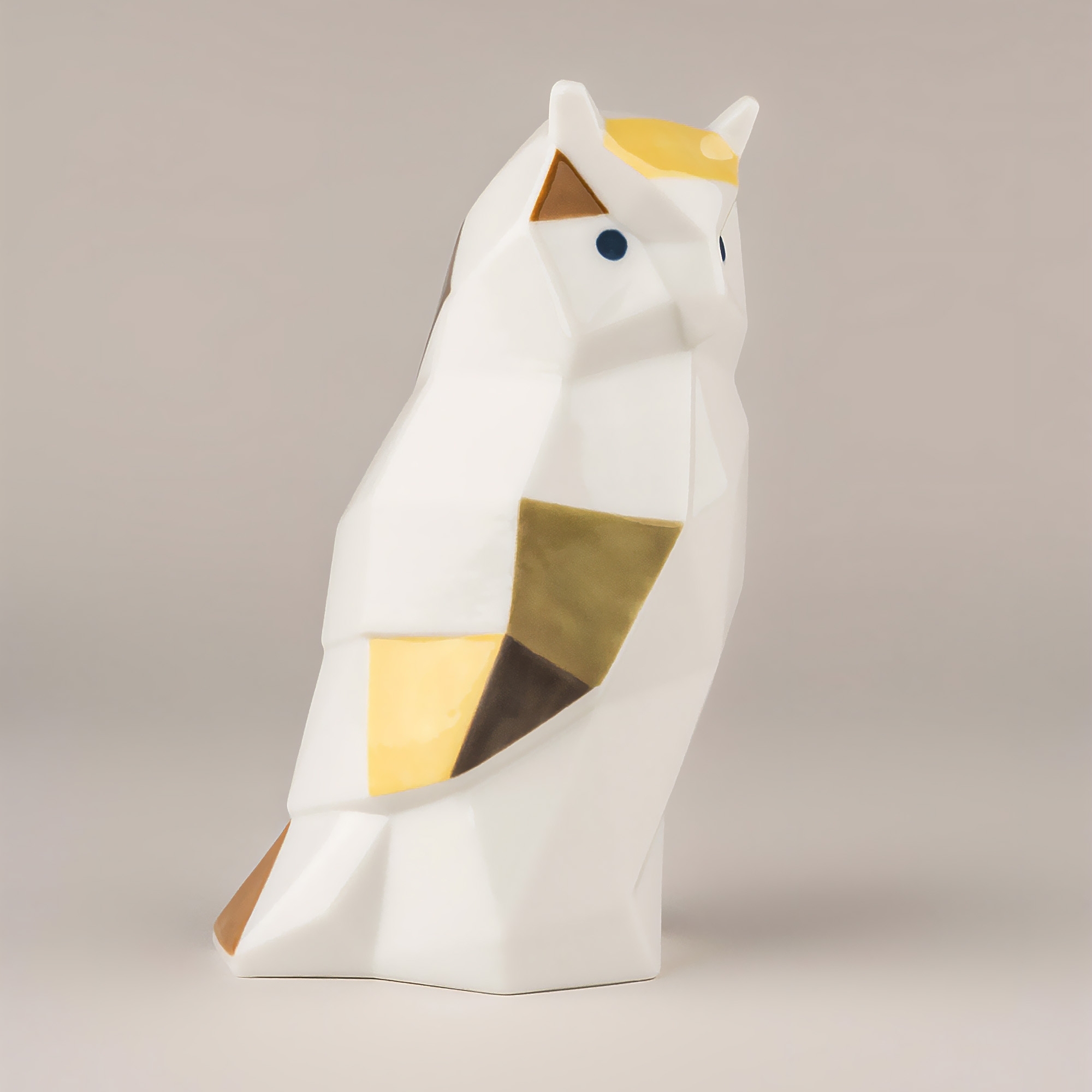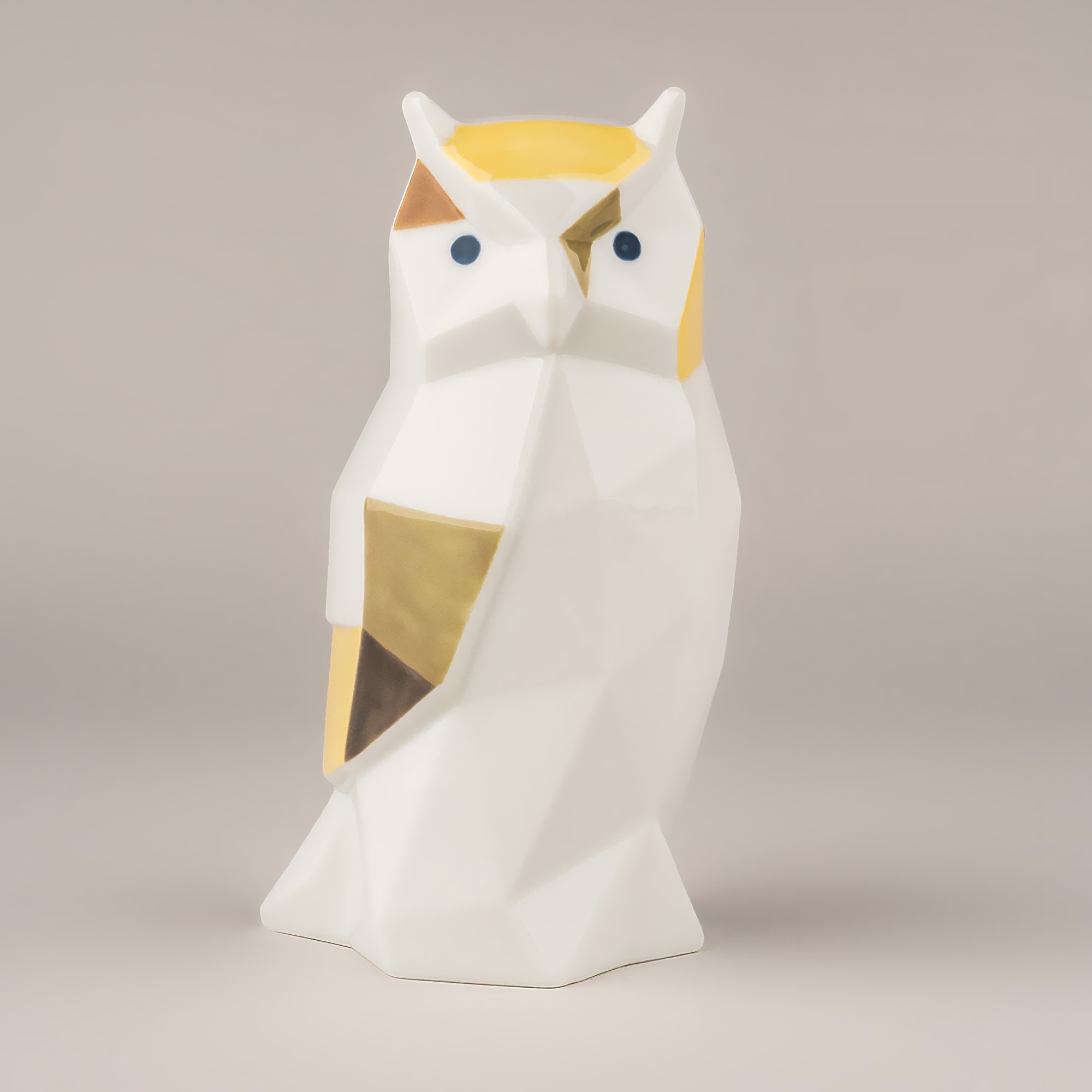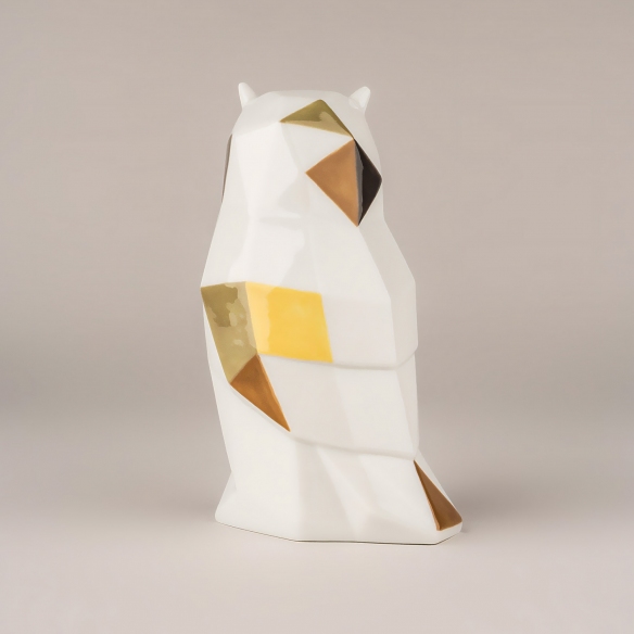 La figurina Gufo è un pezzo innovativo della collezione Origami di Lladró, realizzata interamente in porcellana lucida, materiale apprezzato per la sua eleganza e per la sua notevole durabilità, con una decorazione colorata di verde e giallo che regala alla figurina uno stile senza eguali. Questa figurina Gufo si ispira alla tecnica giapponese della piegatura della carta che produce una deliziosa figura geometrica; grazie al suo stile innovativo, Gufo si abbina armoniosamente a qualsiasi ambientazione e stile di arredamento: che sia posizionata all'interno di una camera da letto, in un salotto dallo stile moderno oppure in un soggiorno più classico, questo pezzo catturerà l'attenzione di tutti i vostri ospiti. L'artigianalità di Lladró è evidenziata attraverso i dettagli e l'attenzione meticolosa; ogni curva è stata progettata per riflettere la luce in un modo diverso, dando vita alla figura con un gioco di ombre sottili che accentuano la muscolatura e l'orgoglio di questo splendido predatore. La figurina Gufo è una perfetta idea regalo per inaugurazioni della casa o altre occasioni speciali. Disegnato da Marco Antonio Noguerón per Lladró.