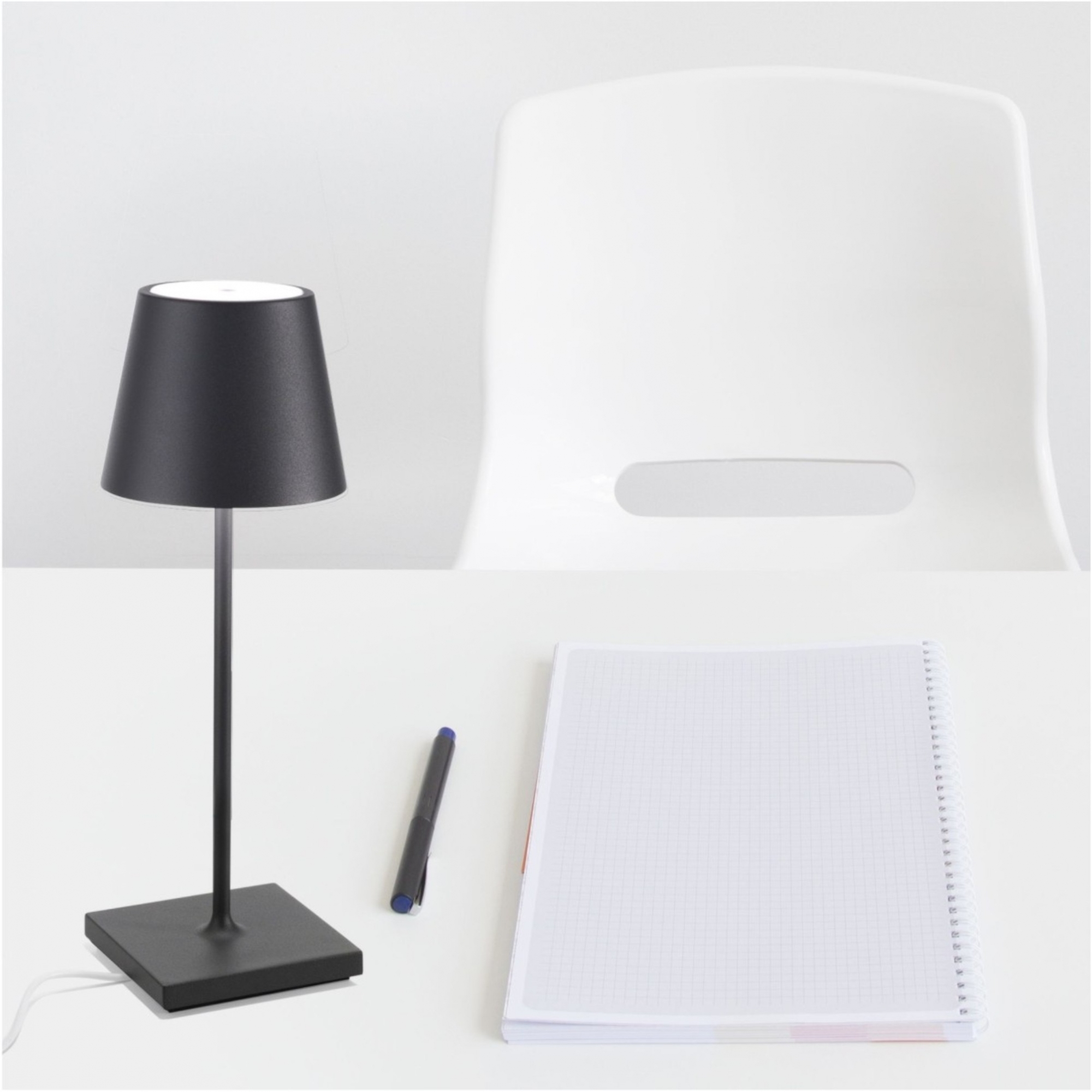 Lampada da tavolo ricaricabile con corpo in alluminio verniciato e diffusore in policarbonato. Lampadina a LED da 2,2 W 3000° K dimmerabile, disegnata da Federico De Majo per Zafferano.