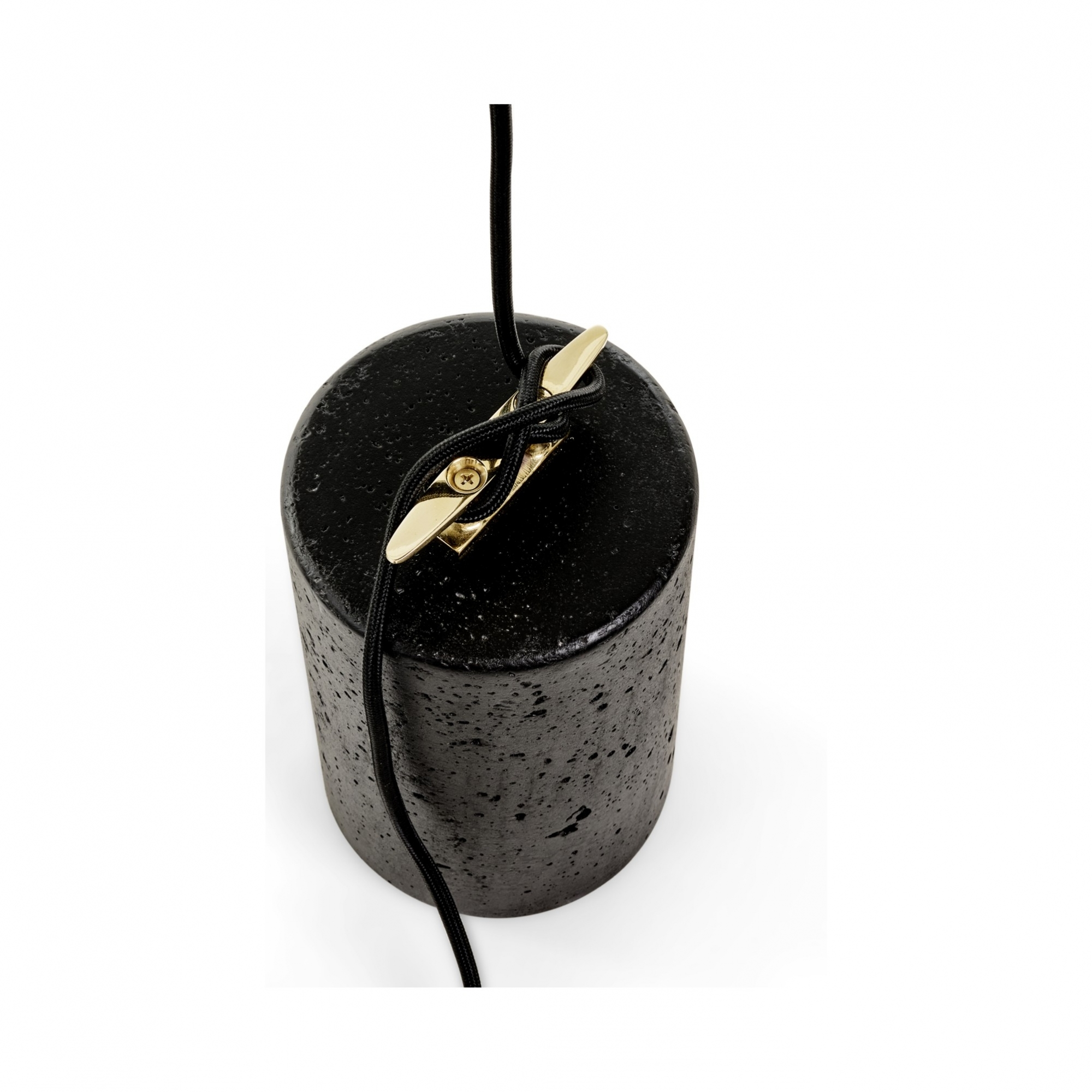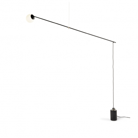 Lampada a sospensione Bitta con struttura in metallo, cavo a soffitto e peso a terra per posizionamento e regolazione di altezza, disegnato da Sebastiano Tosi per Mogg