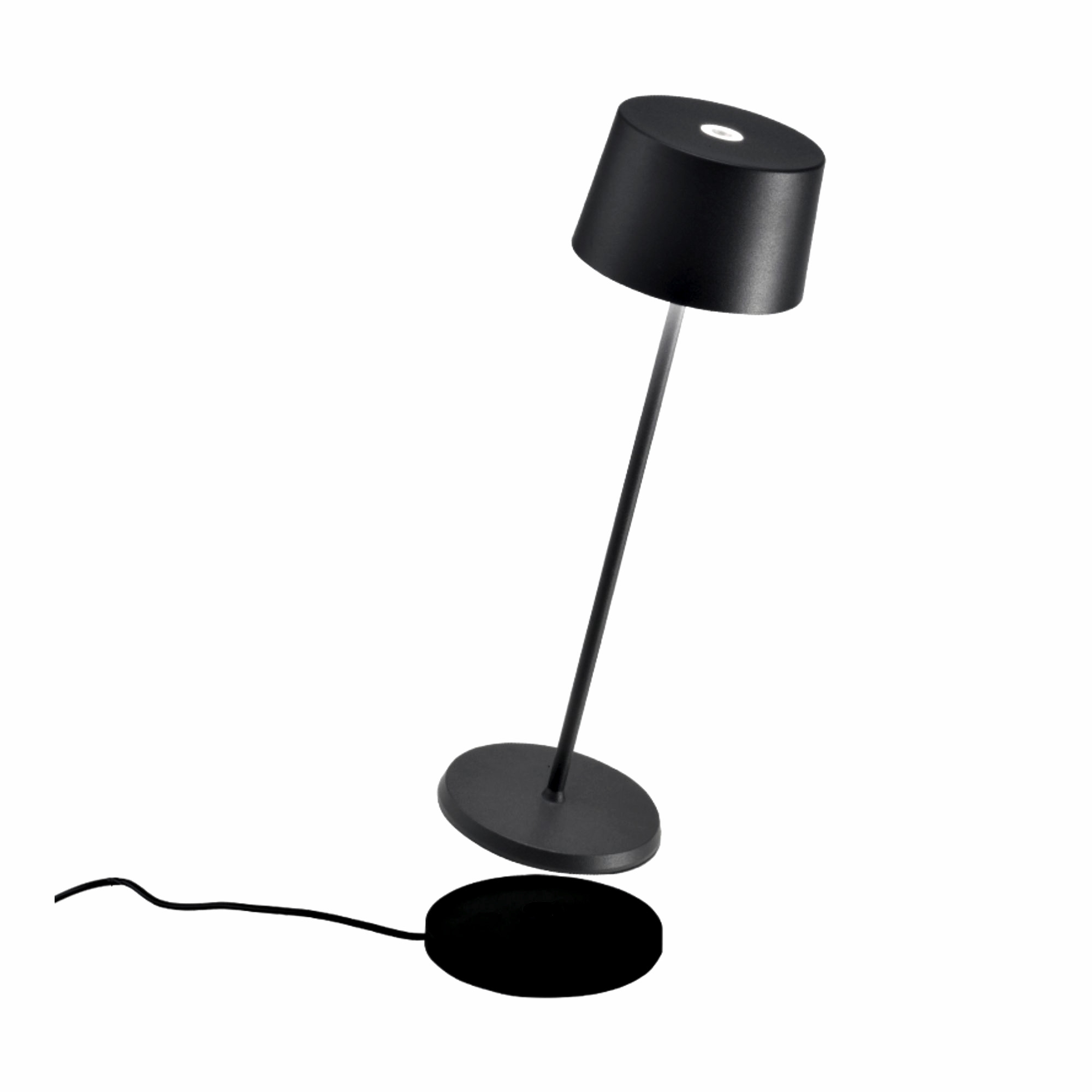 Lampada da tavolo ricaricabile con base a contatto, corpo in alluminio verniciato, diffusore in policarbonato. Lampadina a LED da 2.2 W dimmerabile 2700° a 3000° K. Disegnata da Federico De Majo per Zafferano.