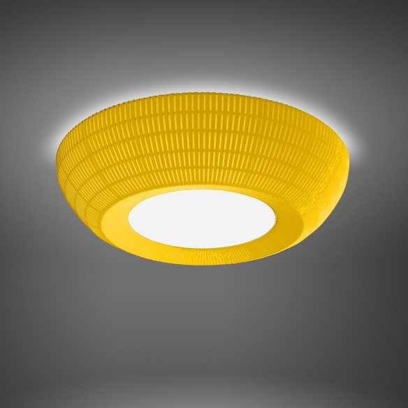 Bell è una collezione di lampade che include sia versioni a sospensione che a soffitto. La versione a soffitto prosegue l'estetica della sospensione, mantenendo la leggerezza data dal tessuto, la multidimensionalità e le variazioni cromatiche. La lampada a soffitto Bell si contraddistingue per le sue dimensioni ridotte e la semplicità delle sue linee, offrendo una grande adattabilità a diversi contesti, sia in ambito residenziale che commerciale. Il tessuto pongé di Bell, oltre ad essere ignifugo, dona alla lampada un particolare valore acustico. Grazie alla sua trama, Bell diventa una lampada acustica in grado di ridurre il rumore fino al 37%. La sua Area Fonoassorbente Equivalente arriva infatti fino a 1,86. Questa caratteristica unica consente alla lampada Bell non solo di illuminare lo spazio, ma anche di migliorare l'esperienza sonora dell'ambiente, contribuendo alla creazione di un'atmosfera confortevole e accogliente. Che si tratti della versione a sospensione o di quella a soffitto, la collezione Bell porta in ogni ambiente un tocco di eleganza e funzionalità, adattandosi perfettamente a diversi stili di arredo. La leggerezza del tessuto, la multidimensionalità e le variazioni cromatiche sono elementi distintivi della collezione Bell, rendendola la scelta perfetta per chi desidera integrare design, luminosità e comfort acustico.