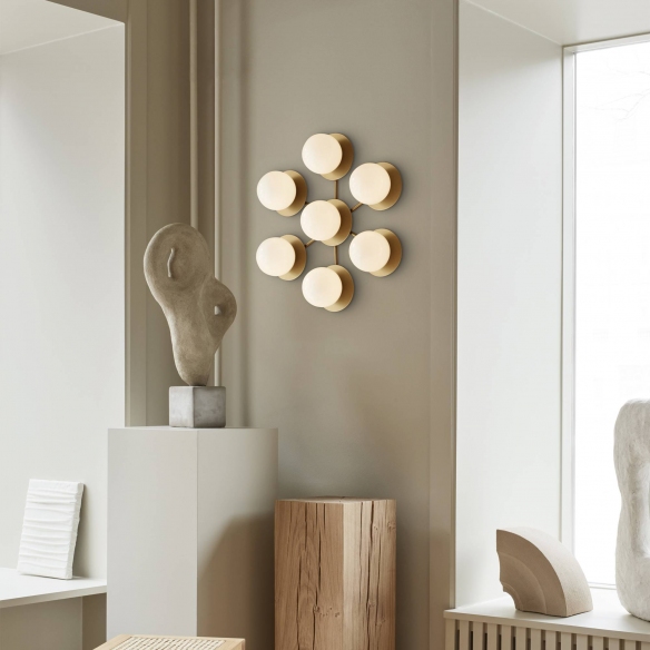 Lampada da soffitto/parete Liila Star è stata realizzata in metallo da abili artigiani. Liila Star è disponibile in due combinazioni ed è ispirato alle stelle brillanti del cielo notturno. La lampada da soffitto/parete Liila Star è perfetta per rendere gli spazi residenziali o commerciali in vere e proprie gallerie d'arte moderna. La struttura è in metallo e le 7 sfere in vetro soffiato a bocca sono i punti focali di questa opera d'arte. La tecnologia LED integrata garantisce un'illuminazione intensa e continua, dimostrazione di come l'innovazione possa andare di pari passo con la sostenibilità. La formazione a stella di Liila Star è perfetto per l'illuminazione decorativa su soffitti ribassati. Disegnata da Sofie Refer per Nuura.