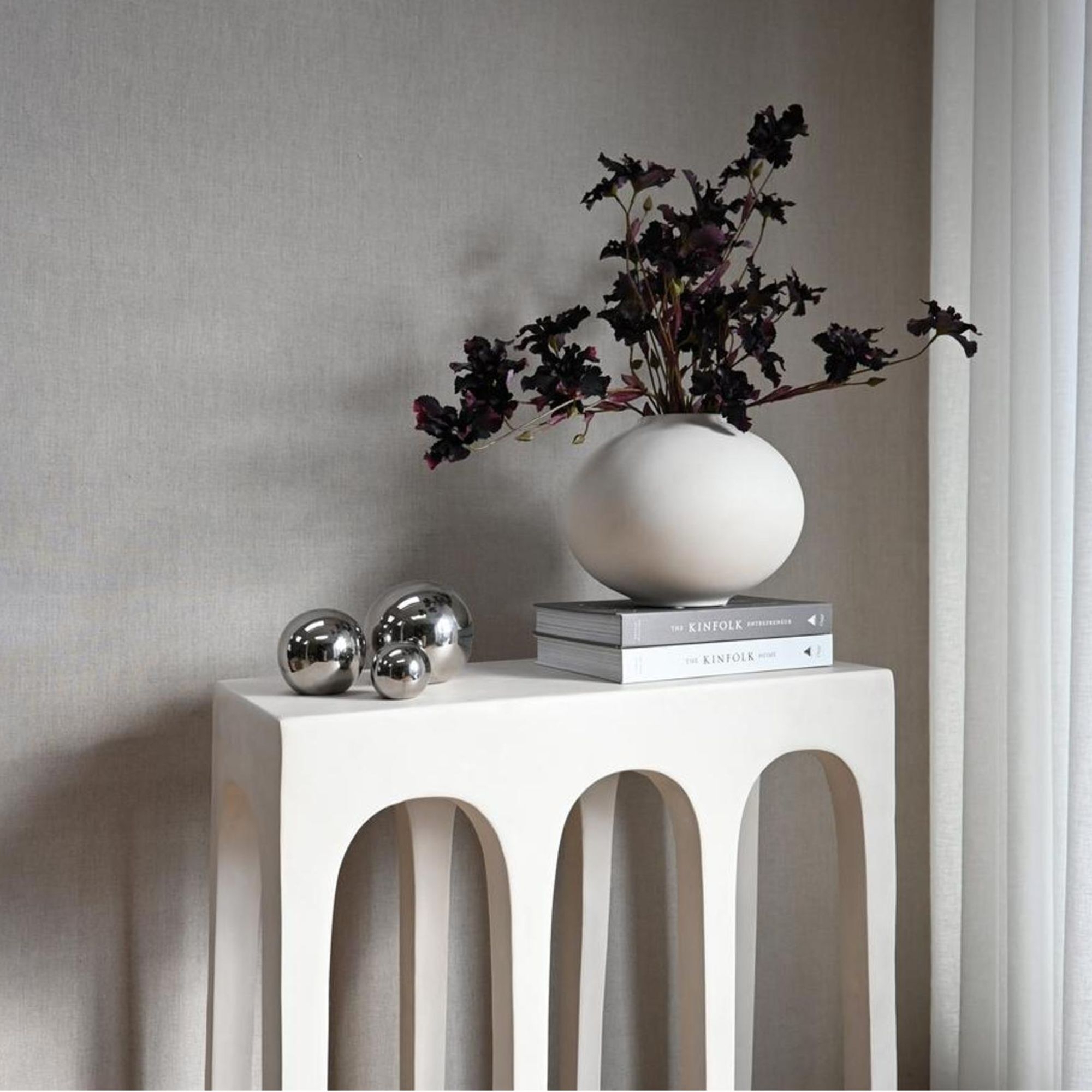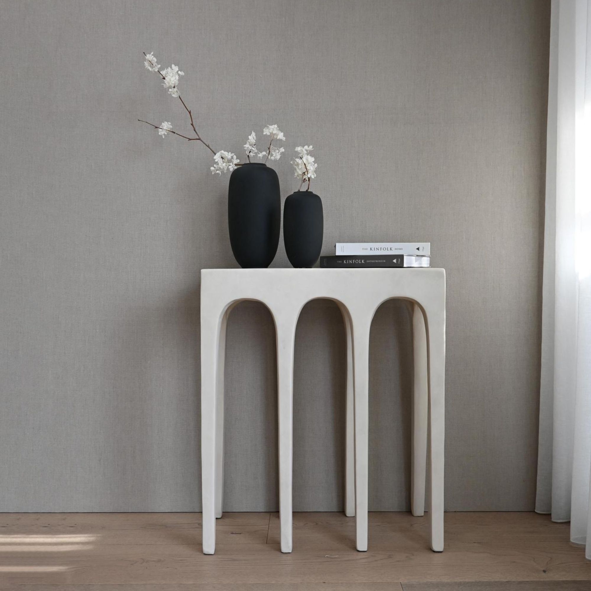 Console Bow in fibrocemento con finitura grezza realizzata a mano. Ispirata alla squisitezza estetica dell'architettura classica, la console Bow è il complemento perfetto per regalare una nota sofisticata al tuo salotto o ufficio. Ha un design lineare e gambe allungate e si presta ad accogliere vasi decorativi o oggetti vari. Disegnata da Kristian Sofus Hansen e Tommy Hyldahl per 101 Copenaghen.