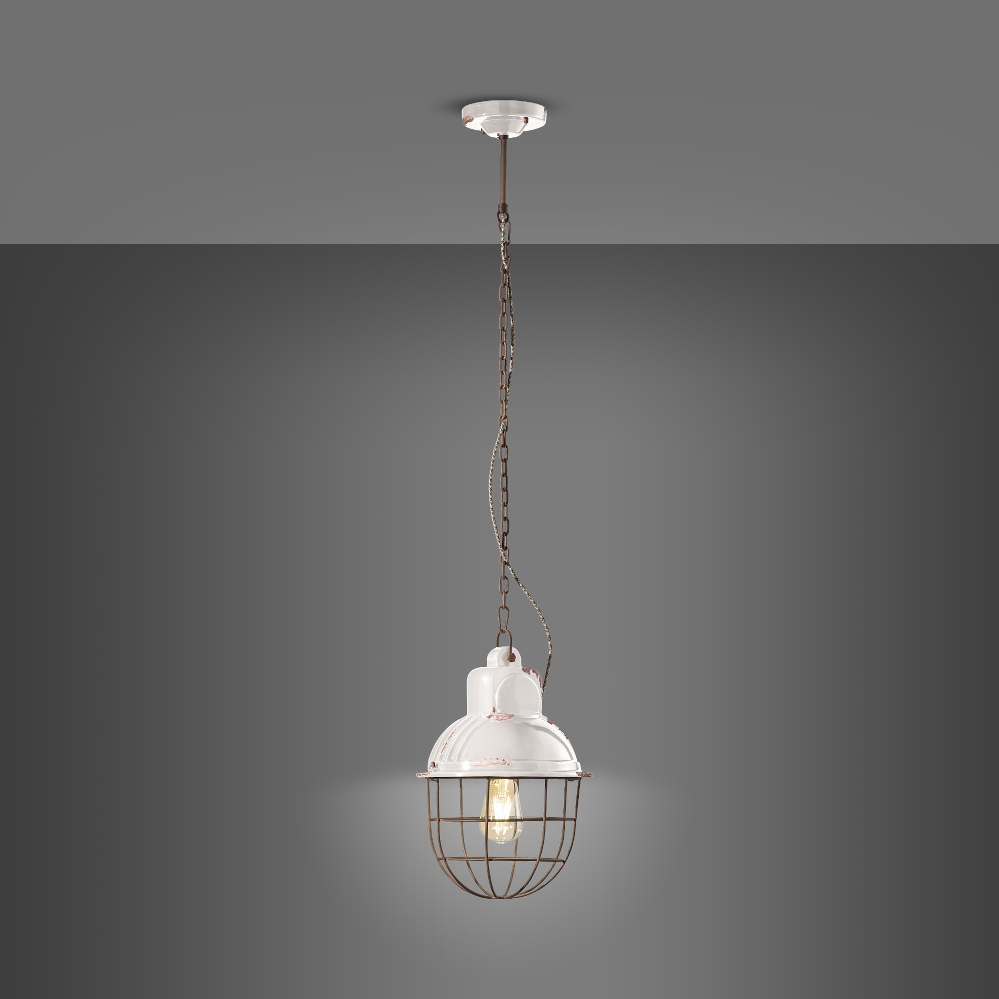 Lampada a sospensione C1770 realizzata in ceramica con cestello e catena in ferro anticato cor ten, cavo in cotone rivestito e smaltatura con effetto ruggine. Perfetta per illuminare e arredare una zona dining o living, la lampada a sospensione C1770 ha un portalampada semisferico in cui la luce è racchiusa da una rete metallica e ricorda un po' le classiche lanterne da giardino anche se è stata appositamente progettata per inserirsi in ambienti interni. Puoi abbinare più elementi insieme e collocarla anche in un bistrot, un bar o una caffetteria. Sorgente luminosa 1x105W E27 - IP20. Progettata e realizzata da Ferroluce.
