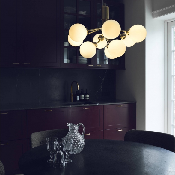 Lampada a sospensione Apiales 9 in metallo, rappresenta 9 sorgenti di luce in vetro soffiato a mano realizzati da abili artigiani. La lampada Apiales 9 è disponibile in 4 diverse versioni (dal tradizionale ottone al moderno nichel) adattabili a qualsiasi tipo di ambiente, dal più vintage al più contemporaneo. L'uso della tecnologia LED garantisce una durata massima e un'efficace illuminazione, e contribuisce anche a creare un atmosfera calda e raffinata. I bracci della lampada si aprono come steli di fiori da cui la luce si diffonde con eleganza. Disegnata da Sofie Refer per Nuura.