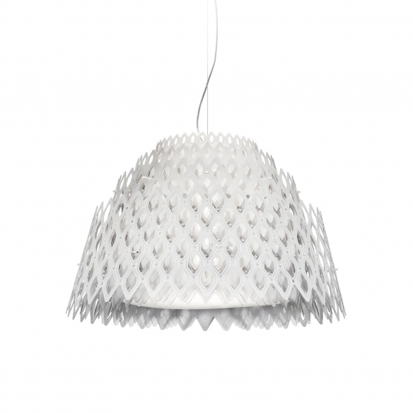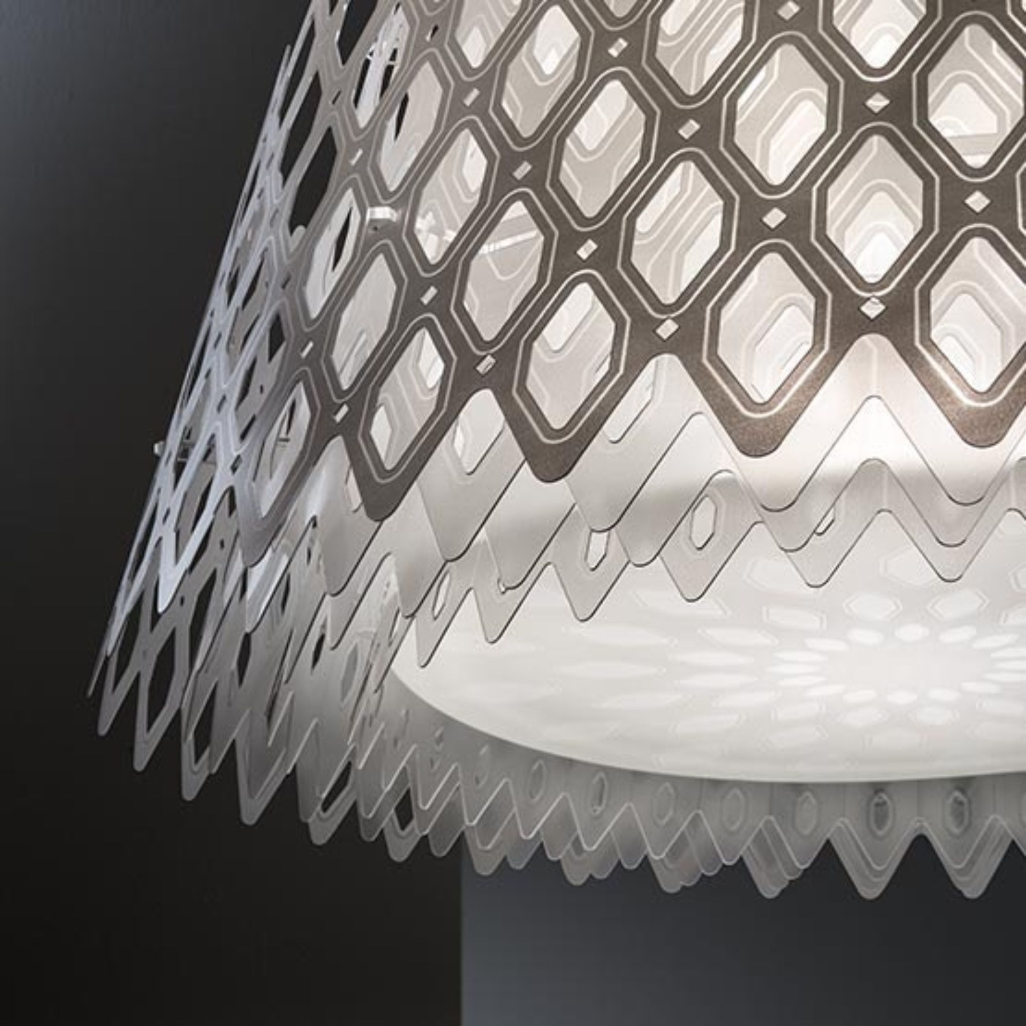 La lampada a sospensione Half Charlotte è una vera e propria espressione di arte e tecnologia realizzata da Slamp in Cristalflex® e Lentiflex®, materiali innovativi di Slamp, infrangibili ed estremamente leggeri. Questa lampada a sospensione ha un design contemporaneo e classico grazie al decoro geometrico forato che emette una luce calda e intima. La lampada è adattabile perfettamente a qualsiasi tipologia di contesto: che sia posizionata sopra un tavolo da pranzo, in un salotto o in un atrio, Half Charlotte promette di essere non solo una fonte di luce, ma anche un punto focale di grande impatto estetico. L'estetica della lampada Half Charlotte si distingue per le sue linee pulite e la sua forma semi-sferica, creando un equilibrio perfetto tra pienezza e vuoto. Questo pezzo di design si abbina a vari stili di arredamento, dal moderno al classico, grazie alla sua capacità di fondere innovazione tecnologica e bellezza senza tempo. Disegnata da Doriana & Massimiliano Fuksas per Slamp.