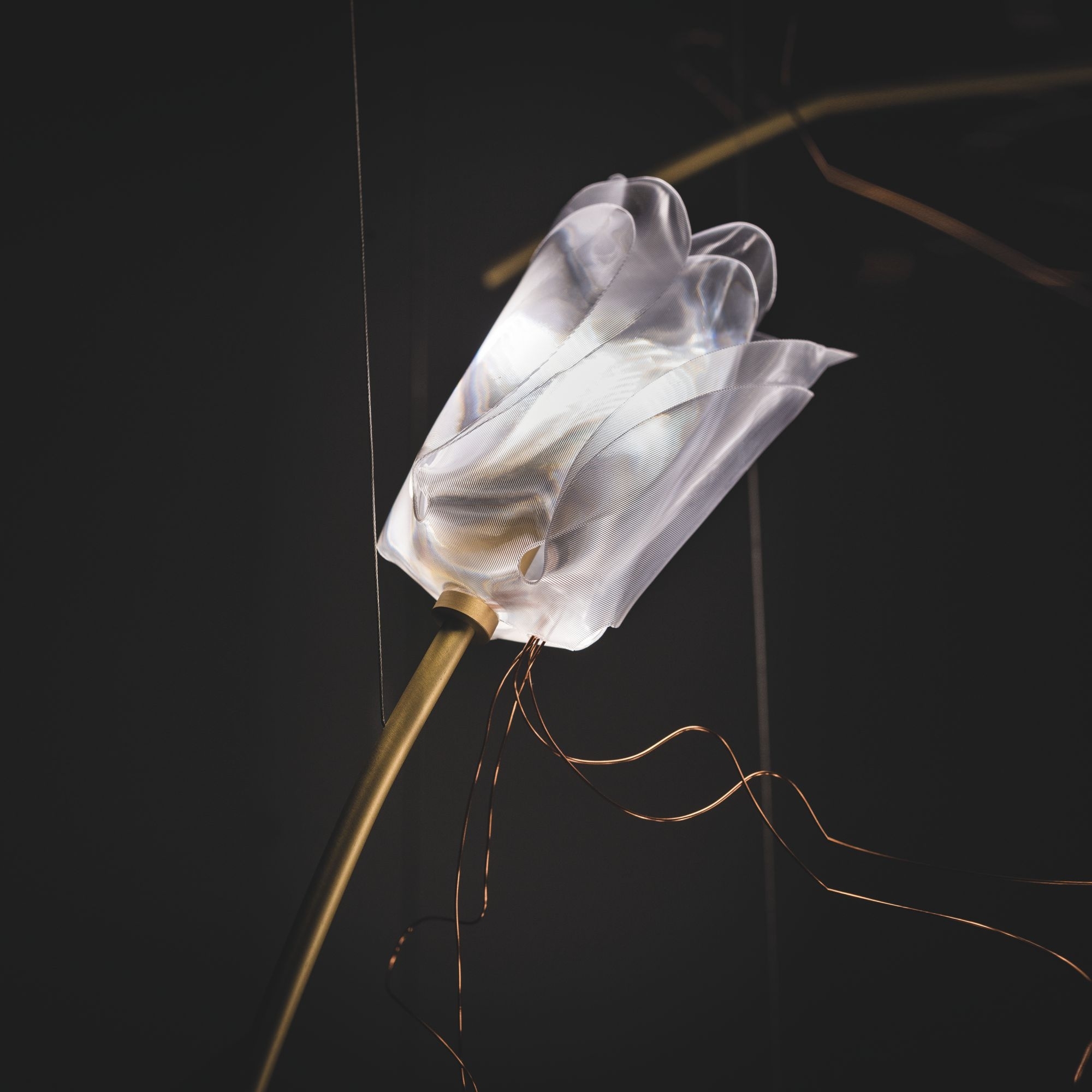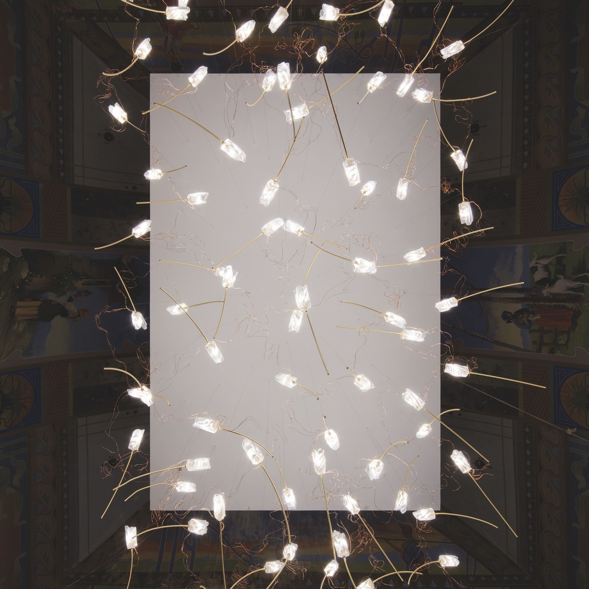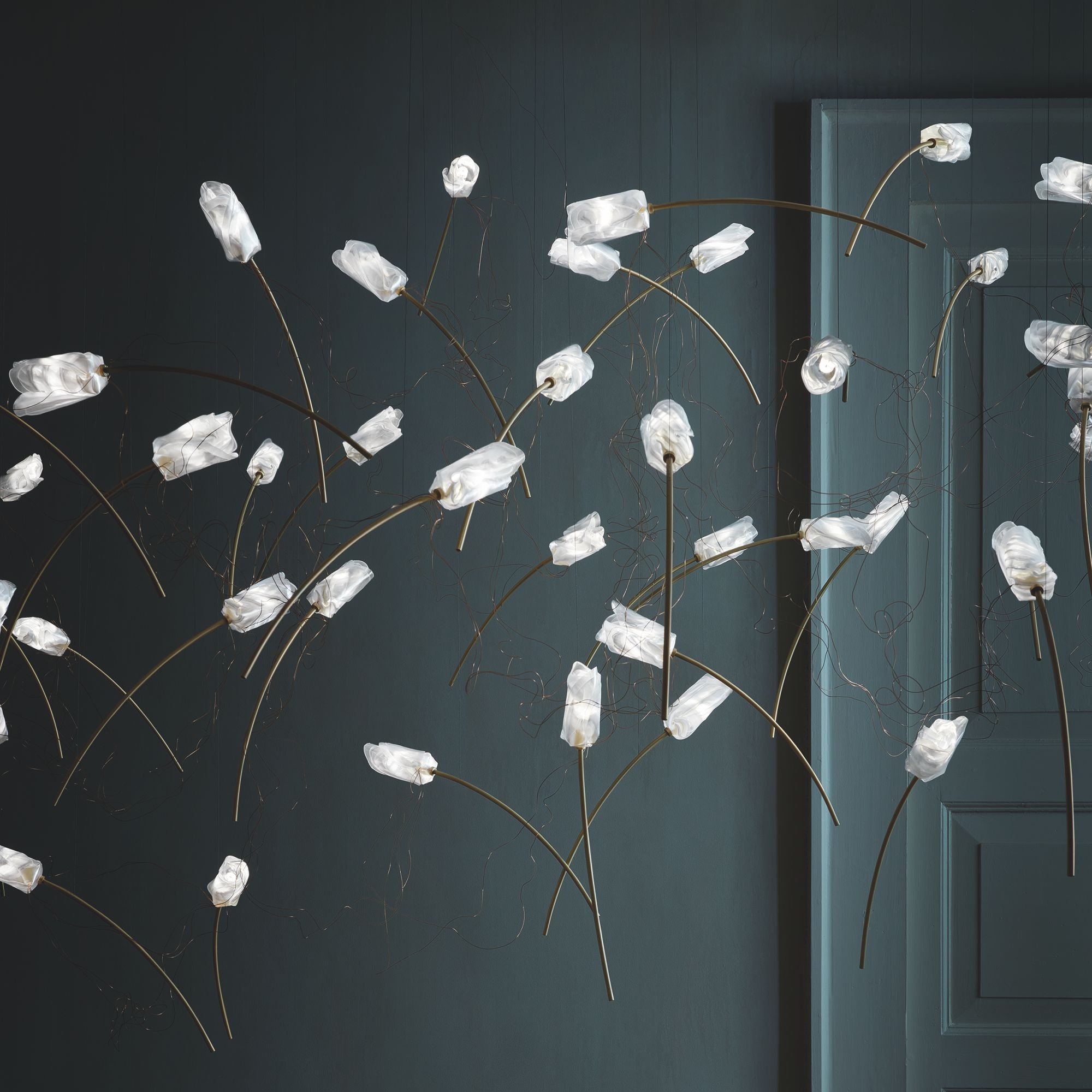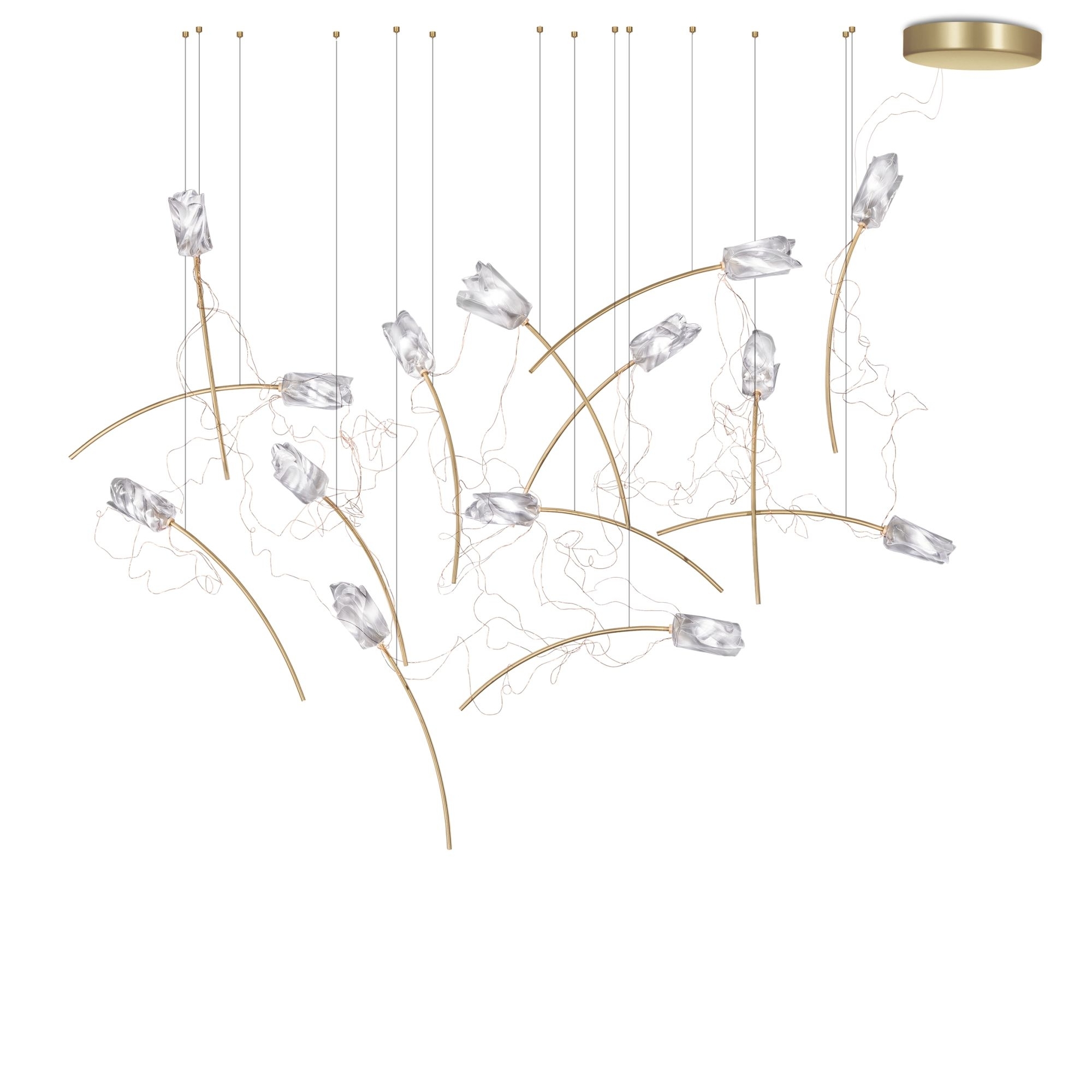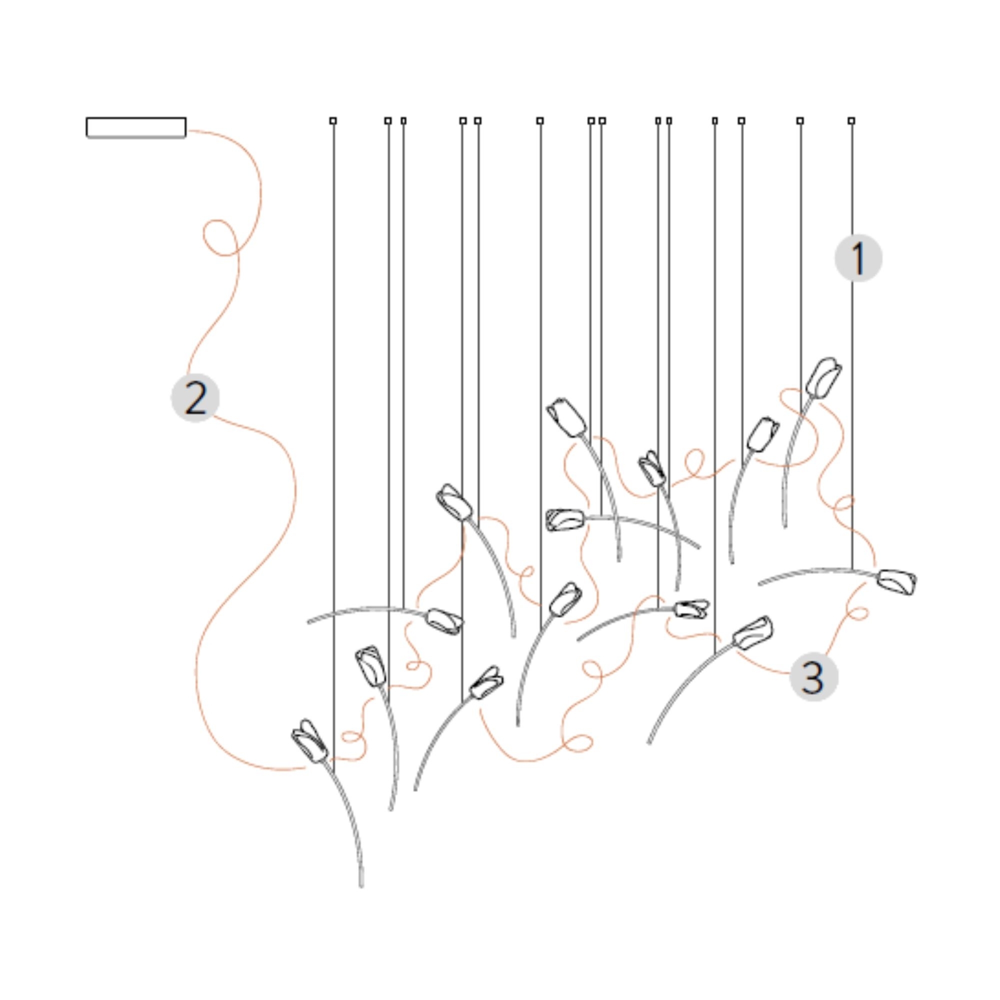 La lampada a sospensione Tulip 14 Free-Standing è una fantastica creazione di Slamp realizzata con cavo di acciaio a tratti invisibile, steli in ottone spazzolato e filo di rame sottile per tenere collegati tutti i tulipani. Questa lampada a sospensione ha un design leggero, elegante e naturale e si integra perfettamente in qualsiasi tipologia di contesto: che sia posizionata all'interno di un ampio ed elegante salotto, in uno studio professionale chic oppure all'interno di ristoranti lussuosi, Tulip è facile da montare e da pulire, riesce a trasformare l'atmosfera in accogliente e raffinata. La collezione Tulip si presenta in configurazioni plug & play (7 o 14 fiori discendono da un rosone in ottone spazzolato rettangolare o rotondo) o free standing, dove con multipli di 14 si può configurare a piacere la propria installazione. Le sorgenti luminose a LED sono incluse e possono essere sostituite autonomamente. Disegnata da Marc Sadler per Slamp.