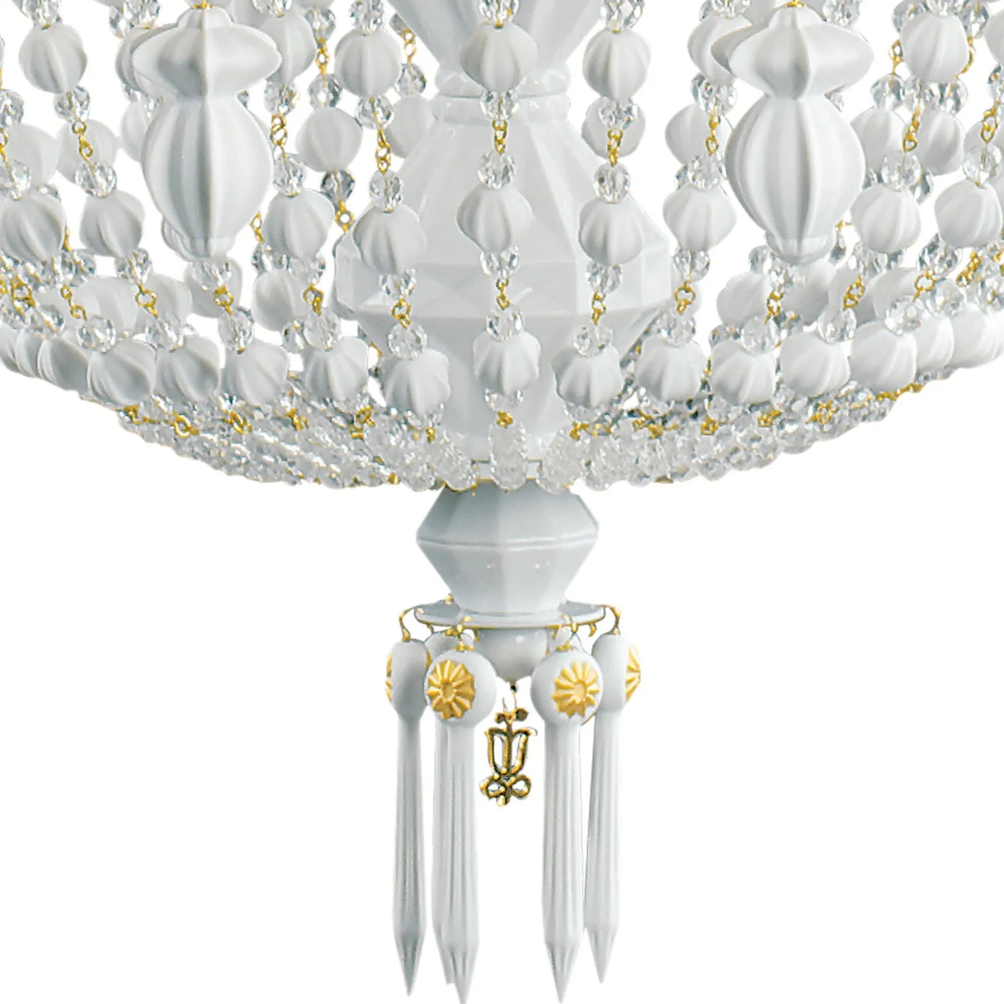 Lampadario Winter Palace a 12 luci realizzato in metallo bianco-oro e porcellana traslucida. Questa lampada a sospensione, caratterizzata da una struttura in metallo bianco con finiture dorate lussuose, è ornata da splendidi tulipani in porcellana traslucida che diffondono una luce calda e accogliente in ogni ambiente. Perfetto per chi cerca un tocco di classe e sofisticatezza, il lampadario Winter Palace trasforma ogni spazio in un regale salone di bellezza e comfort. Adatto per ambienti eleganti, questo pezzo di arredo esclusivo non è solo una fonte luminosa, ma un'opera d'arte che arricchisce la decorazione della tua casa con un fascino senza tempo.