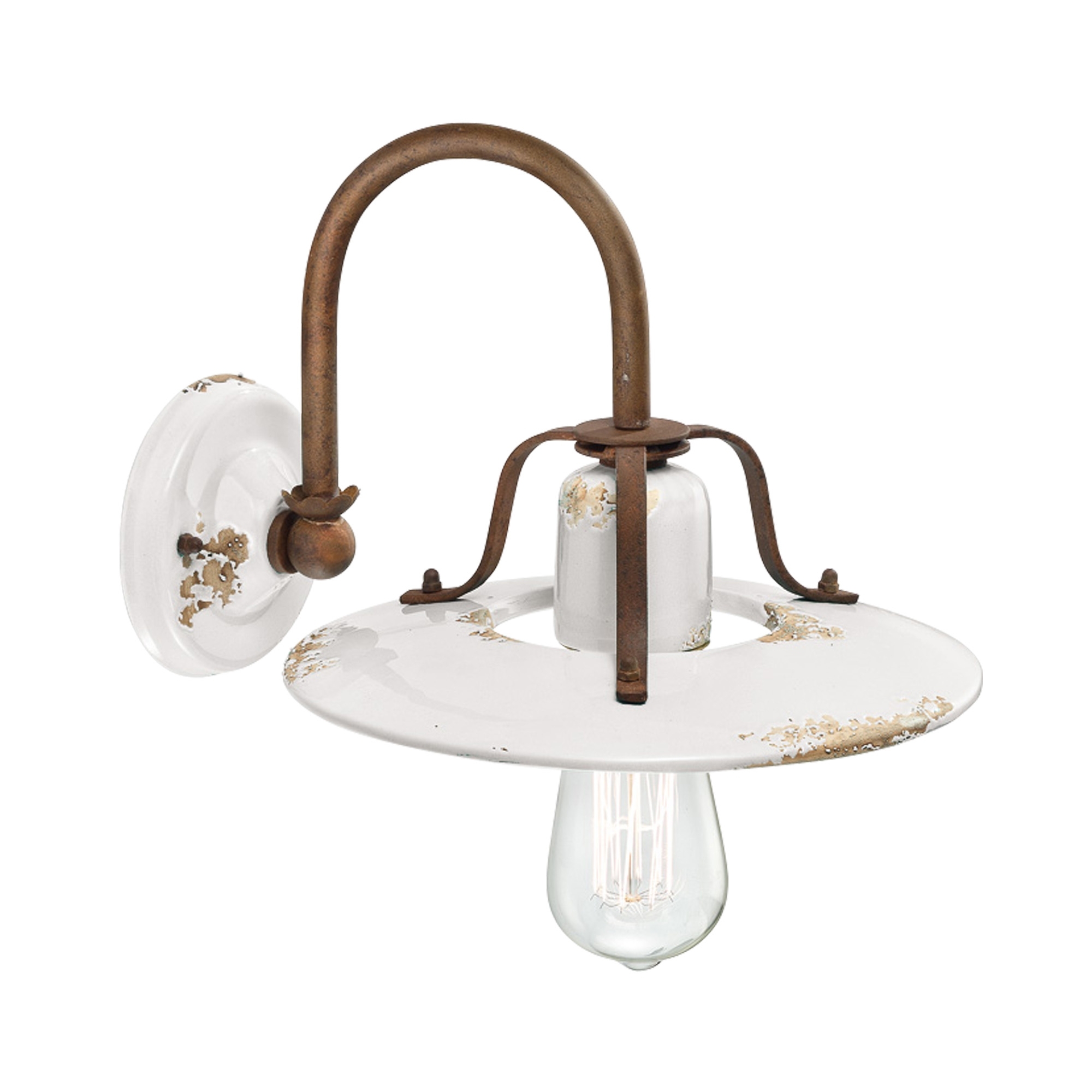 Lampada da parete C1440 realizzata in ceramica con montatura in ferro anticato cor-ten. Disponibile in diversi colori per adattarsi al tuo stile e arredamento, la lampada da parete C1410 è l'ideale per illuminare un corridoio, un salotto o l'ingresso e regalare fascino ai tuoi spazi con un diffusore che ricorda le lampade d'altri tempi e un effetto ruggine volutamente ricreato sulla ceramica. Sorgente luminosa 1x77W E27 - IP20. Progettata e realizzata da Ferroluce.