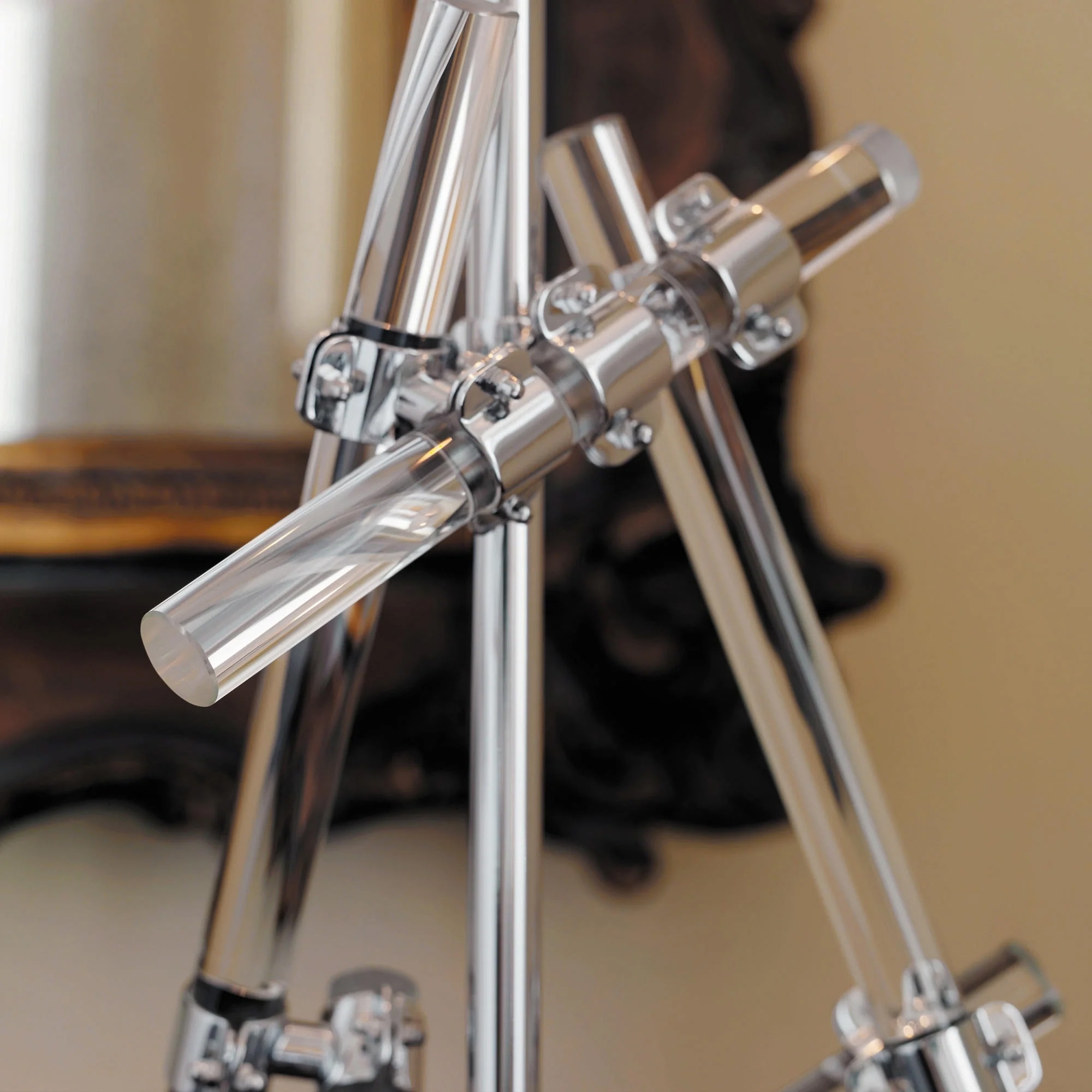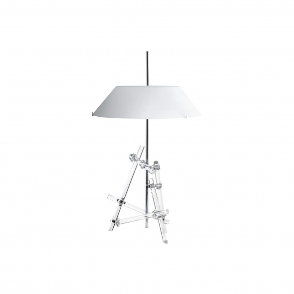 Lampada da tavolo Ashanghai realizzata con montatura in ottone cromato, base realizzata con tubi in vetro borosilicato trasparente, giuiunti di fissaggio in ottone cromato, diffusore in vetro soffiato incamiciato bianco acidato e disco diffusore superiore in vetro float in lastra sabbiato sui due lati. La lampada da tavolo Ashanghai rappresenta un'icona del design del XX secolo, frutto del genio creativo di Max Ingrand, maestro francese e direttore artistico di FontanaArte nel periodo del 1955. Questa lampada combina armoniosamente funzionalità e estetica, diventando un oggetto di design atemporale. La funzionalità dimmerabile a pulsante consente di regolare l'intensità luminosa secondo le esigenze, rendendo Ashanghai perfetta per creare diverse atmosfere luminose. L'utilizzo dell'ottone cromato per la montatura e i giunti di fissaggio, combinato al vetro borosilicato per la base e al vetro soffiato incamiciato bianco acidato per il diffusore, denotano un attentissimo studio dei materiali che esaltano la qualità e il design della lampada. La lampada da tavolo Ashanghai, con il suo design sofisticato e la sua luce diffusa e calda, rappresenta non solo un punto luce ma un vero e proprio oggetto d’arte. Sorgente luminosa 3x max 30W E14. Disegnata da Max Ingrand per Fontana Arte.