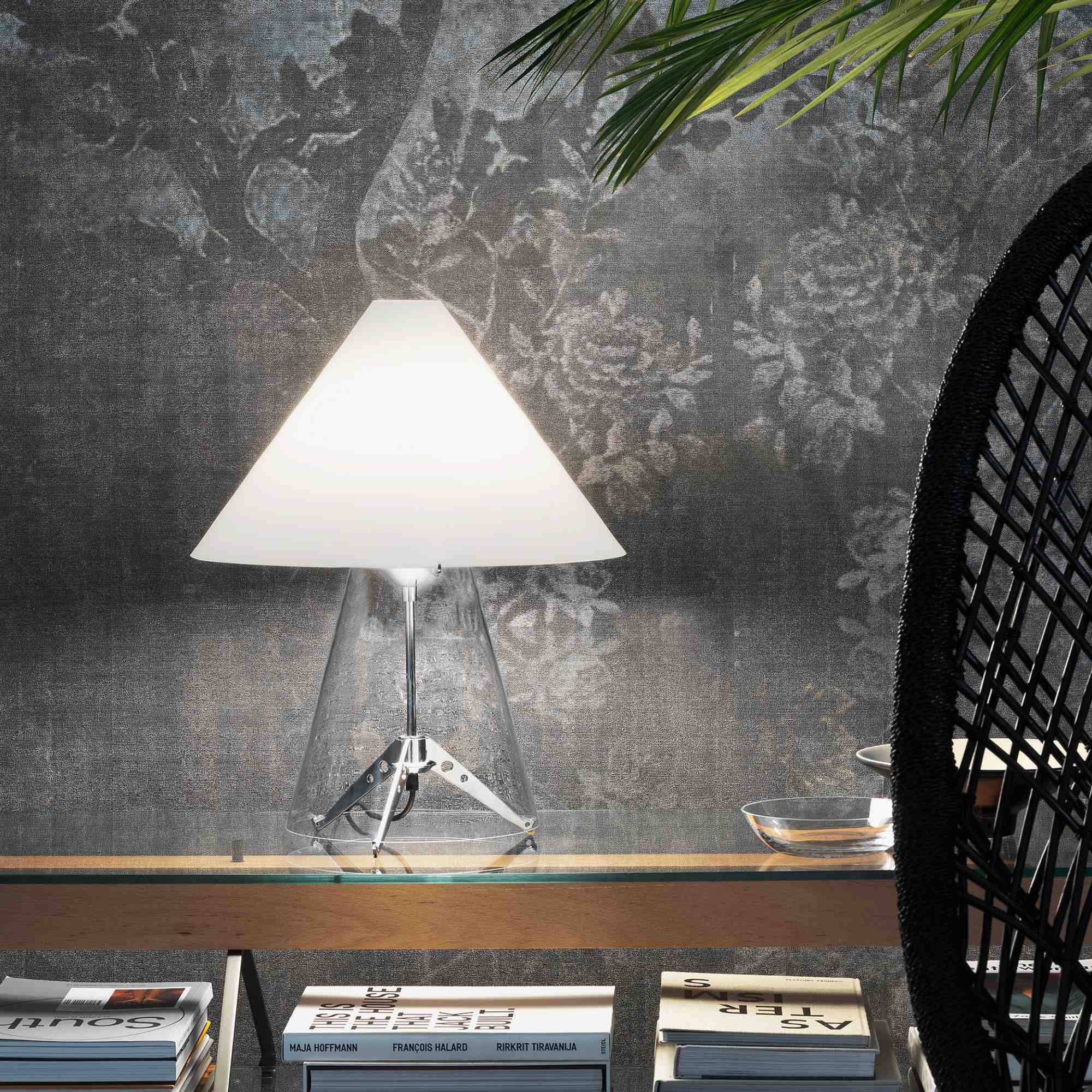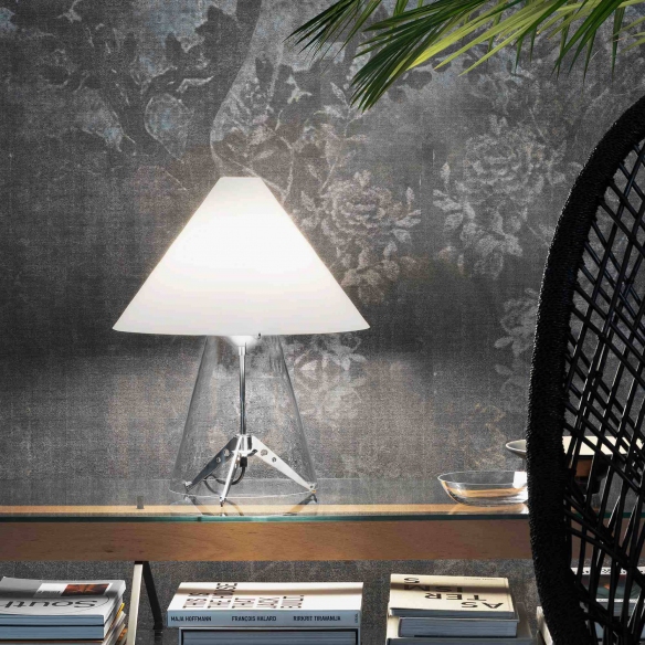 La lampada da tavolo Metafora è una vera e propria opera d'arte realizzata da Fontana Arte con la montatura in metallo cromato, base in vetro soffiato trasparente e diffusore in vetro soffiato lucido colorato in pasta. Questa lampada da tavolo nasce negli anni '80, ed è composta da questo diffusore conico a strati di vetro opalino, sorretto da una base in vetro trasparente che nasconde la struttura in metallo, e questo design meraviglioso fa sì che Metafora si abbini a qualsiasi stile di arredamento; infatti, la lampada può essere posizionata sopra uno scaffale in un salotto moderno, oppure all'interno di una camera da letto dallo stile più classico. Metafora, inoltre, è in grado di creare un'atmosfera intensa e confortevole, e può essere utilizzata per leggere un libro o anche per passare dei momenti di relax in solitudine o in compagnia. Il colore bianco trasparente dona alla lampada da tavolo uno stile mai visto prima, portando eleganza e raffinatezza sia in ambienti domestici, che in ambienti professionali. Non farti scappare l'opportunità di avere un simbolo di design all'avanguardia all'interno della tua casa. Disegnato da Umberto Riva per Fontana Arte.