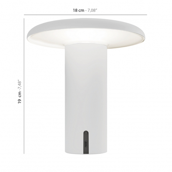 Lampada da tavolo portatile Takku realizzata in alluminio e metacrilato, dal diametro di 18 cm e altezza di 19 cm. Lineare e funzionale, Takku è una lampada portatile a luce diffusa, la cui intensità luminosa può essere graduata su tre diversi livelli a seconda dell'ambientazione che si desidera creare, semplicemente grazie allo speciale sistema ottico, collocato alla sua base. 20 ore di autonomia, LED integrato non sostituibile 2,4W -3000K, 45lm - CRI=90 - IP 20 - Ricarica USB. Progettata da Foster+Partners per Artemide.