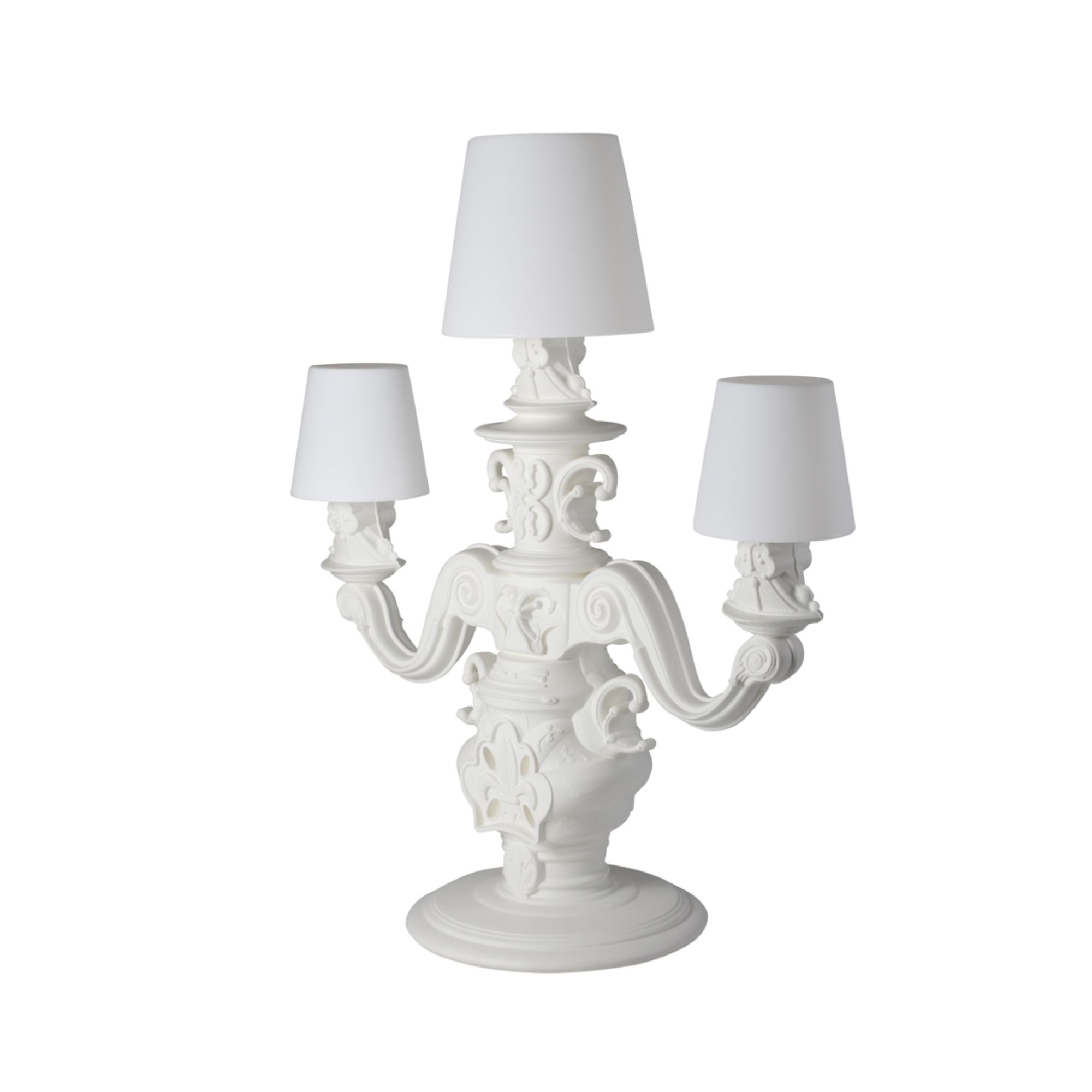 La lampada da terra King of Love è una maestosa creazione di Slide, realizzata interamente in polietilene riciclabile 100%, materiale ammirato per la sua versatilità, resistenza e longevità. La base della lampada è in stile barocco, mentre i tre ampi paralumi bianchi luminosi sono impreziositi da una texture di motivi classici, per ottenere un decoro raffinato, elegante e piacevole al tatto. Questa bellissima lampada da terra è disponibile in varie colorazioni e ciò la rende abbinabile a qualsiasi tipologia di arredamento, sia nelle ambientazioni indoor, sia in quelle outdoor: che sia posizionata in un giardino con piscina, all'entrata di casa oppure in terrazze chic, King of Love dimostra come il design possa essere sia audace che versatile. Lo stile ironico e pop dell’intera collezione della Design of Love caratterizza fortemente anche questa lampada da terra dalle dimensioni imponenti. La lampada da terra King of Love è senza dubbio la testimonianza della passione per il design che caratterizza il marchio SLIDE. Design di Moro & Pigatti per Slide.