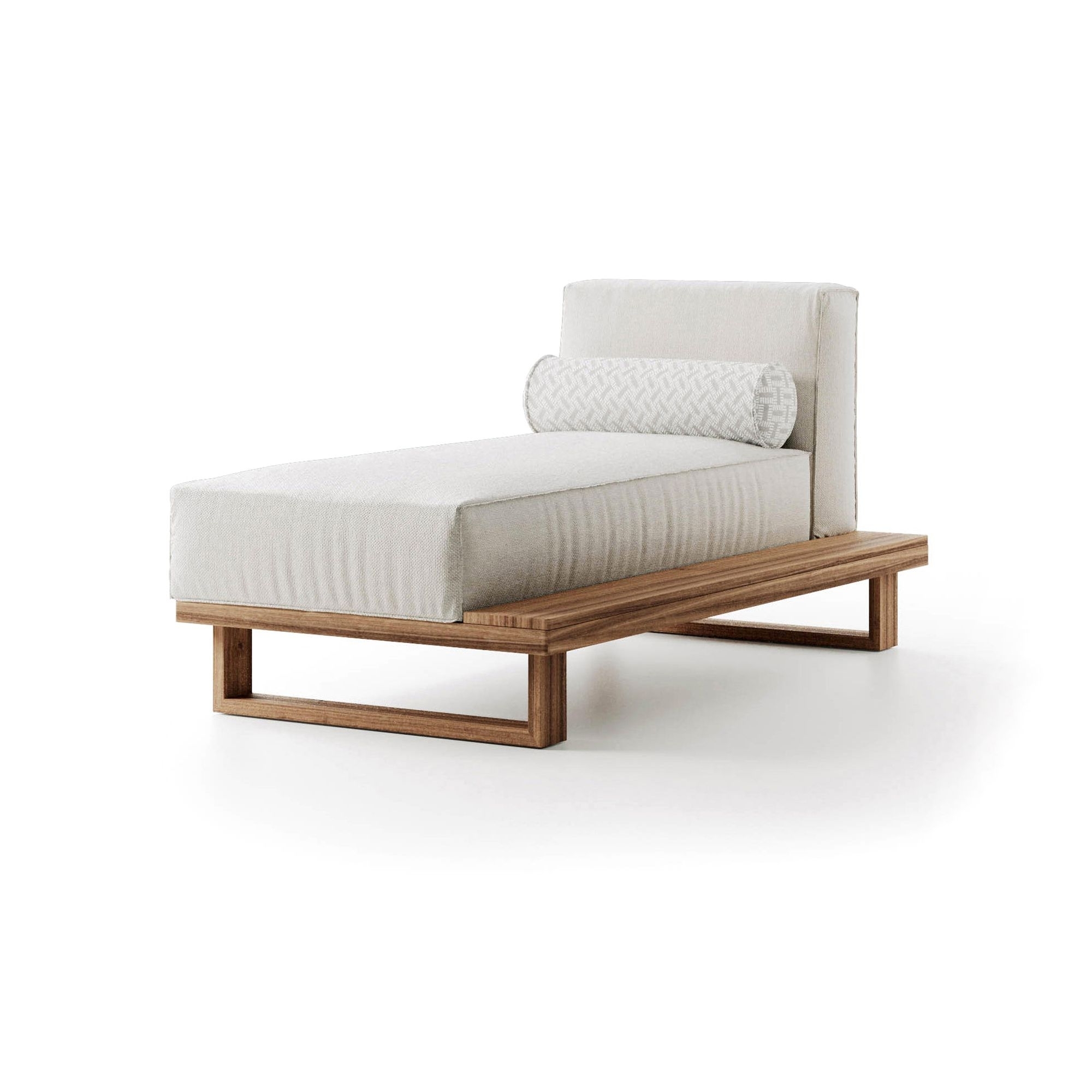 Modulo lettino destro 9.zero realizzato con struttura in teak massiccio asiatico e seduta in gomme drenanti rivestite in tessuto tecnico da esterno. Questo modulo chaise longue, realizzato in teak massiccio asiatico, offre un'eleganza senza tempo combinata alla massima resistenza agli agenti atmosferici. I suoi nove listelli di legno, caratteristica distintiva della linea 9.zero, conferiscono un design pulito e moderno, ed hanno ciascuno una larghezza di nove centimetri, garantendo un comfort superiore e una durata eccezionale. La lavorazione meticolosamente curata del legno di teak esalta la calda tonalità naturale e la grana distintiva, creando un'atmosfera di raffinatezza e calore in ogni ambiente esterno. La chaise longue è dotata di cuscini morbidi e spessi, rivestiti di tessuti pregiati e idrorepellenti, progettati per resistere all'escursione termica e ai raggi UV, garantendo un benessere prolungato all'aperto. Con la sua linea fluida e accogliente, la chaise longue 9.zero si integra perfettamente con altri elementi della stessa serie, consentendo di personalizzare lo spazio outdoor secondo le proprie necessità di stile e di relax. Ideale per momenti di riposo e di piacere, sia in ambiti privati che in spazi contract, questo modulo chaise longue non è solo un pezzo d'arredo, ma un vero e proprio invito a godersi la vita all'aria aperta con eleganza e comfort. Disegnato da Atmosphera Creative Lab.