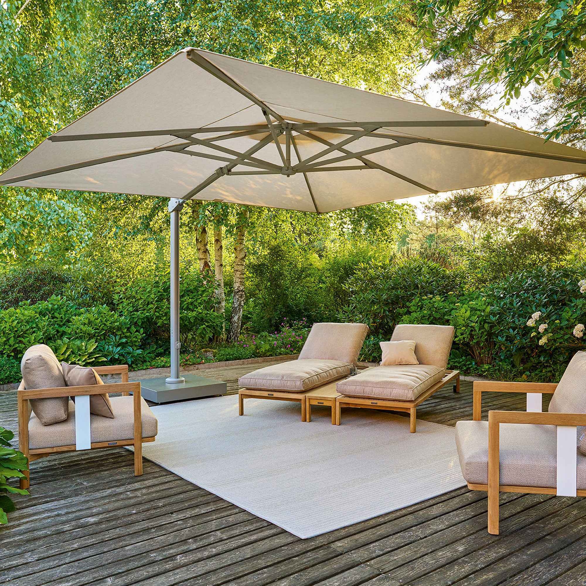 Ombrellone da giardino Cantilever (3x3 m) realizzato con base in alluminio e telo in tessuto Acrylfabric. Disponibile in una vasta gamma di colori, l'ombrellone da giardino Cantilever è la soluzione ideale per chi ricerca spaziosità e funzionalità. Pensato per situazioni in cui lo spazio è fondamentale, come una tavola all'aperto predisposta ad accogliere numerosi amici o per quei bistrò dove il palo centrale rappresenterebbe solo un ostacolo. L'ombrellone Cantilever si distingue per una serie di pregi convincenti: ad esempio, il meccanismo a manovella scorrevole che rende l'apertura dell'ombrellone un gioco da ragazzi. Il design elegante e sottile in alluminio permette all'ombrellone di ruotare e inclinarsi, consentendovi di regolarlo secondo la posizione del sole con un solo gesto. Con il suo stile moderno e la praticità d'uso, l'ombrellone Cantilever di Weishäupl è più di un semplice accessorio da esterno: è un elemento che ridefinisce la vivibilità degli spazi aperti, assicurando protezione dal sole e un’estetica senza paragoni, progettato per chi non vuole rinunciare a design e comfort nel proprio ambiente esterno.