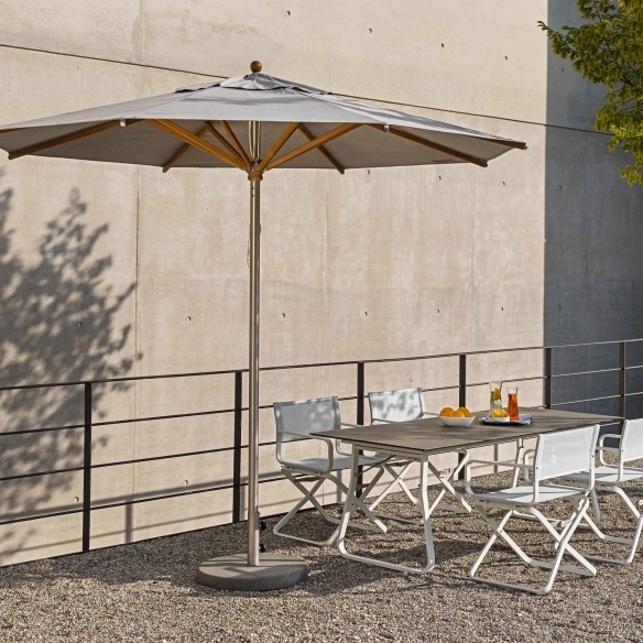 Ombrellone rotondo da giardino Trend realizzato con telaio in Teak massiccio, polo centrale in acciaio inox AISI 304, telo parasole in tessuto outdoor Acrylfabric e base in cemento. Disponibile in una vasta gamma di colori, l'ombrellone rotondo Trend incarna un'incontro unico tra il classico e il moderno, grazie ai caldi montanti in teak abbinati a dettagli in acciaio inossidabile finemente lucidato: un contrasto materico che ne fa dei veri e propri tuttofare in grado di adattarsi e valorizzare qualsiasi contesto esterno. Questi ombrelloni rappresentano il complemento ideale per chi desidera unire funzionalità, eleganza e versatilità. Creato per armonizzarsi con l'architettura moderna, Trend si accosta perfettamente sia a facciate in vetro e cemento, offrendo un'ombra rinfrescante adiacente a piscine scintillanti, sia a strutture più tradizionali con facciate in legno, integrandosi con discrezione e stile. La base rotonda in cemento, inclusa, garantisce stabilità e sicurezza, consentendo all'ombrellone Trend di ergersi fiero e inarrestabile, un vero statement di design che si distingue per la sua capacità di fondere insieme resistenza, bellezza e funzionalità. Realizzato da Weishäupl.