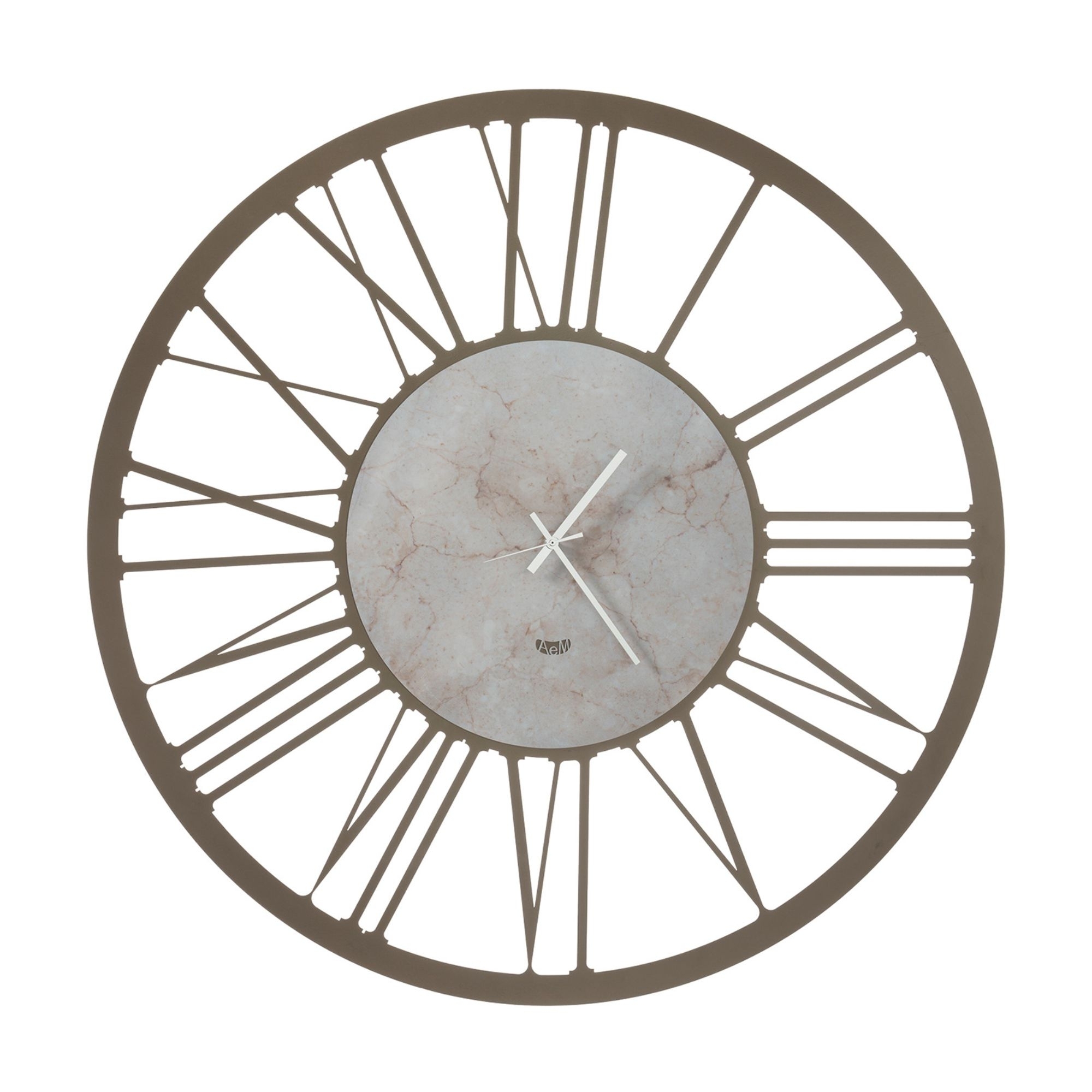 Orologio da parete Big 90 realizzato in ferro e disponibile nelle versioni Bronzo-Marmo Travertino o Nero-Marmo Nero con due lancette lineari e moderne posizionate su un grande quadrante effetto marmo, una cornice essenziale e minimalista definita da grandi numeri romani che gli danno forma e struttura per regalare una nota elegante e sofisticata alle pareti di casa. Progettato e realizzato da Arti e Mestieri.