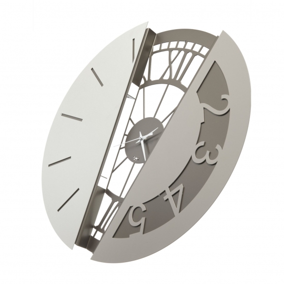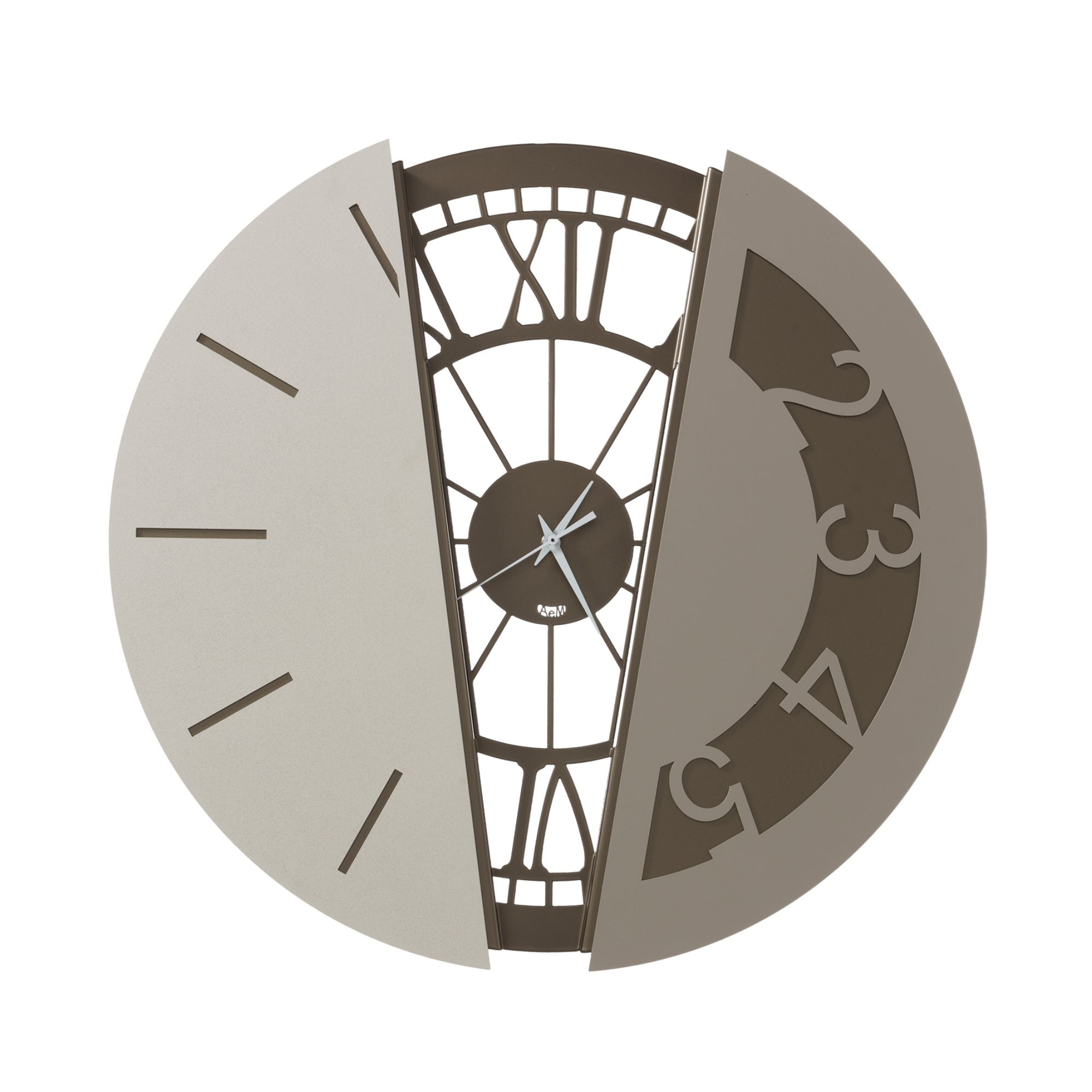 Orologio da parete Metamorphosi realizzato in ferro e disponibile nelle versioni Bronzo-Avorio-Sabbia o Nero-Bianco Marmo-Alluminio e composto da tre diverse sezioni: un quadrante centrale che ricorda gli orologi in stile classico con grandi numeri romani lungo la sua cornice, un quadrante destro completato da numeri arabi e uno sinistro in stile analogico. L'orologio è adatto a completare il look di una cucina, un salotto o un'area studio di casa. Progettato e realizzato da Arti e Mestieri.