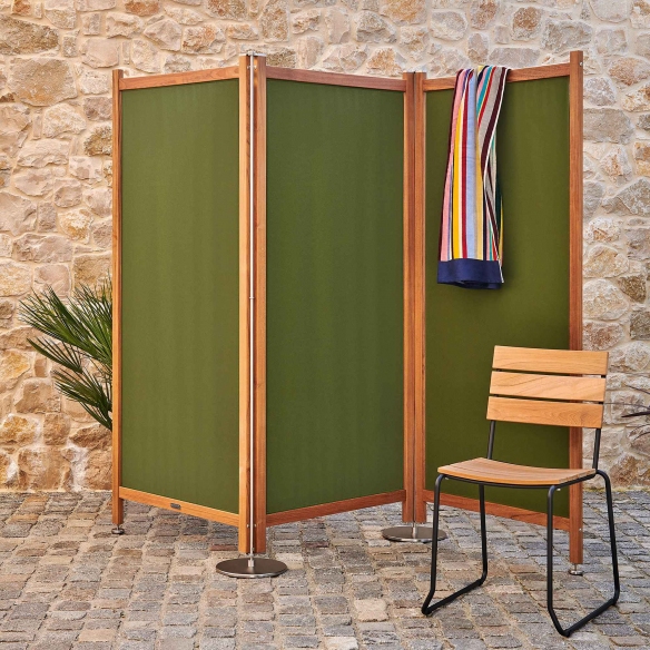 Paravento pieghevole da esterno a 2 pannelli realizzato con struttura in teak robusto, piedi in acciaio inossidabile e rivestimento in tessuto acrilico per esterni. Disponibile in una vasta gamma di colori, questo paravento è un complemento d'arredo versatile e indispensabile per qualsiasi spazio esterno. Progettato per offrire privacy, protezione e un tocco di stile, questo paravento è la soluzione ideale per terrazze, balconi, giardini o qualsiasi area all'aperto dove si desidera creare un angolo riservato o ripararsi da vento e sguardi indiscreti. Grazie alla sua struttura pieghevole, il paravento è estremamente facile da installare e riporre quando non in uso, permettendo una massima adattabilità alle tue necessità. I suoi 2 pannelli possono essere posizionati in diverse angolazioni, offrendo così personalizzazione e versatilità per adattarsi al meglio allo spazio disponibile. Realizzato con materiali di alta qualità, resistente agli agenti atmosferici, il paravento coniuga eleganza e durabilità. Il design è attentamente studiato per integrarsi armoniosamente con l'ambiente esterno, aggiungendo un tocco di classe al tuo spazio. Realizzato da Weishäupl.