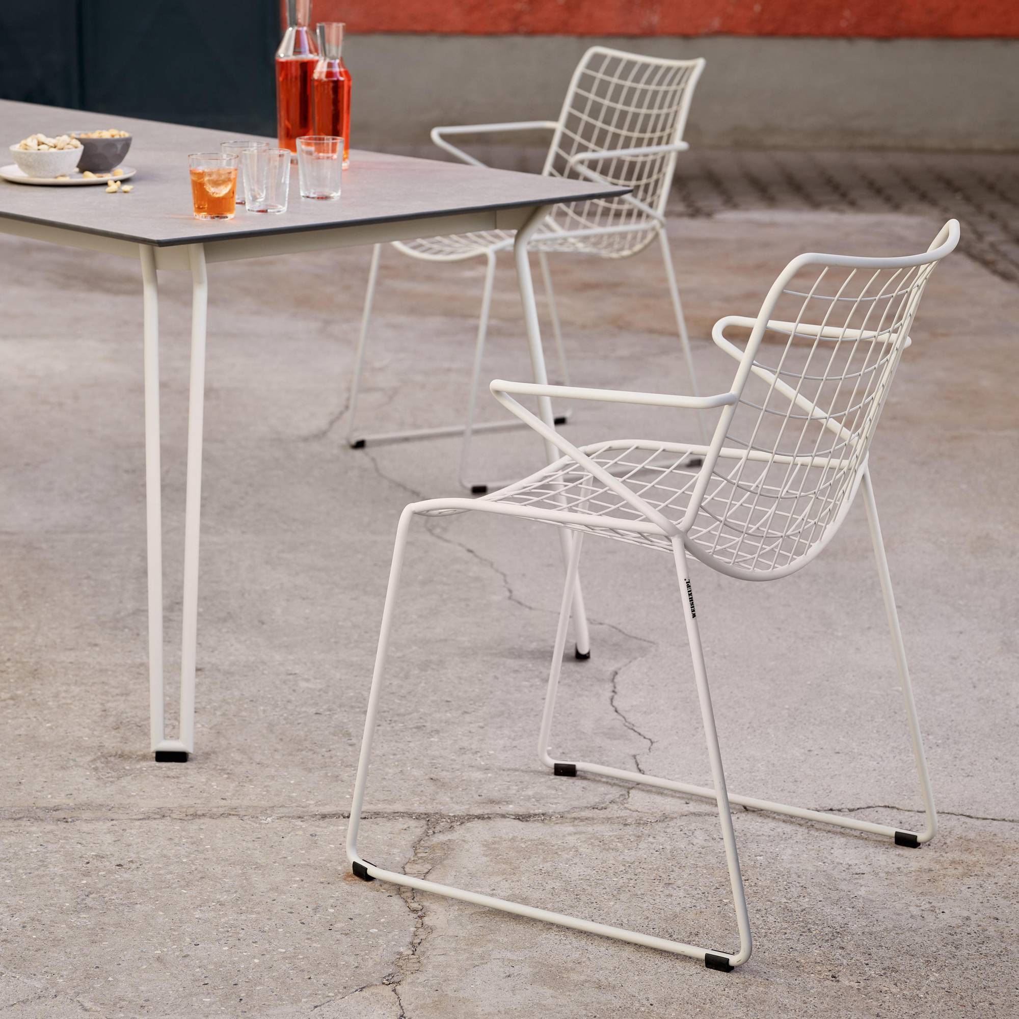 Poltroncina da esterno Racket realizzata in alluminio verniciato a polvere. Disponibile in svariate finiture di colore, la poltroncina outdoor Racket, in linea con le dinamiche tendenze del design contemporaneo, si rivela un pezzo da maestro che trasforma ogni spazio esterno in una galleria d'arte a cielo aperto. La scelta di materiali adatti all'esterno garantisce la durabilità del prodotto, mantendendo inalterato il fascino estetico nel tempo e assicurando una facile manutenzione. Leggera e pratica, questa poltroncina è facilmente spostabile, permettendoti di riallineare con semplicità la tua configurazione outdoor in base alle tue esigenze o all'occasione. Nata dalla trasformazione della nostra collaudata linea Slope, Racket sostituisce la tradizionale copertura in poliestere con una raffinata rete metallica, creando un gioco di trasparenze che cattura lo sguardo e arricchisce l'ambiente con una leggera e ariosa presenza. Disegnata da Thomas Albrecht per Weishäupl.
