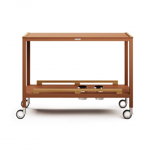 Consolle da esterno Flair realizzata con struttura in ferro zincato e verniciato a polveri epossidiche per esterni, dettagli in teak massiccio Asiatico e piano in HPL. Disponibile in 3 colori, la consolle outdoor Flair combina design elegante e funzionalità avanzata, rendendola un'aggiunta eccellente per qualsiasi spazio esterno. Realizzata con materiali di altissima qualità, questa consolle promette resistenza e durabilità contro gli agenti atmosferici. I dettagli in teak massiccio asiatico offrono un tocco naturale e raffinato, conferendo alla consolle un aspetto caldo e accogliente. Il top in HPL è particolarmente adatto per l'uso all'aperto, grazie alla sua resistenza alle intemperie e alla facilità di manutenzione. Completata di 4 ruote, di cui 2 girevoli a 360°, la consolle Flair è facilmente spostabile, permettendo di adattare con agilità la disposizione dei vostri spazi esterni in base alle esigenze del momento. Che si tratti di utilizzarla come supporto per le piante, come stazione per le bevande durante una festa, o semplicemente come un accattivante punto focale nel vostro giardino o patio, la consolle Flair è progettata per migliorare sia la funzionalità che l’estetica del vostro spazio all’aperto. Disegnata da Atmosphera Creative Lab.
