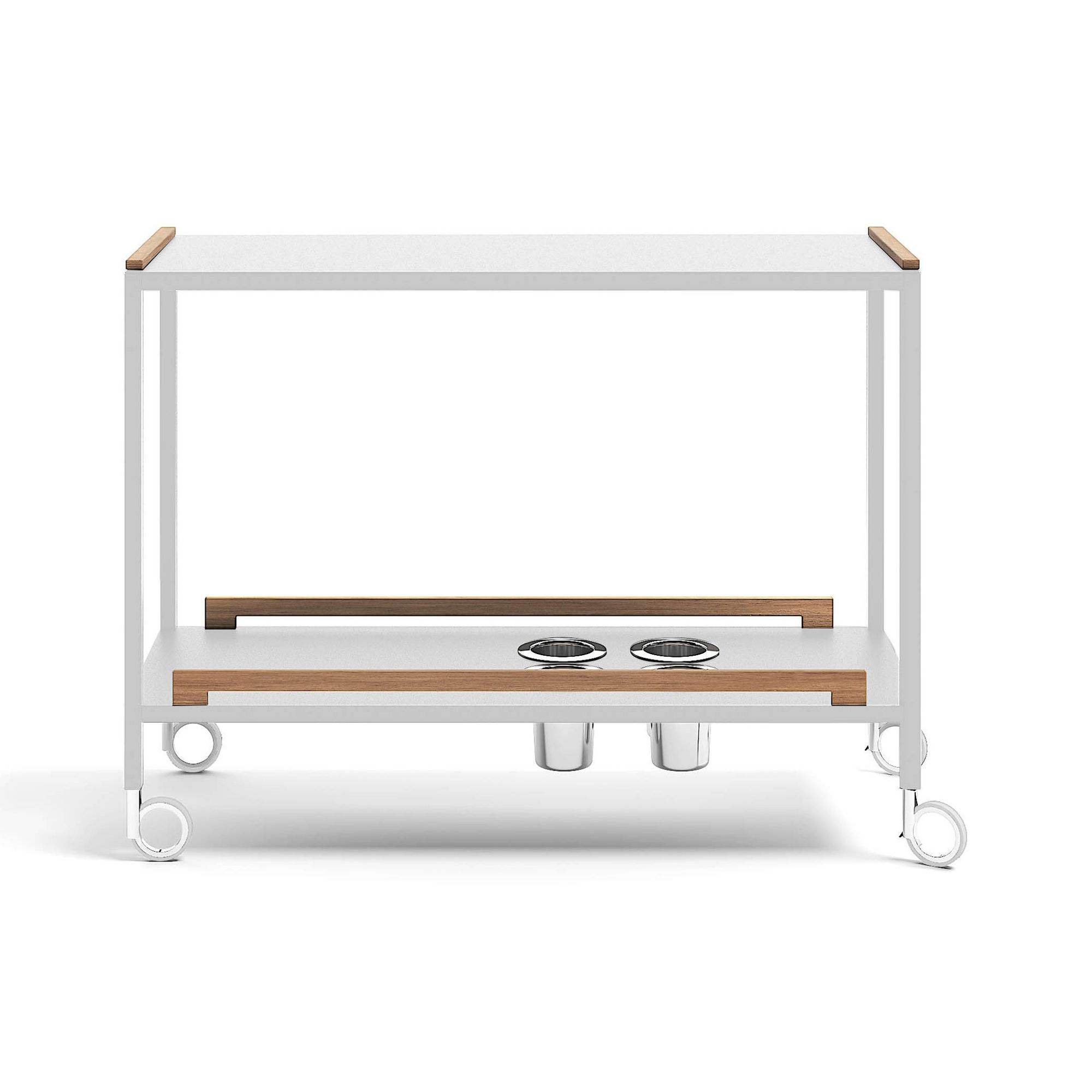 Consolle da esterno Flair realizzata con struttura in ferro zincato e verniciato a polveri epossidiche per esterni, dettagli in teak massiccio Asiatico e piano in HPL. Disponibile in 3 colori, la consolle outdoor Flair combina design elegante e funzionalità avanzata, rendendola un'aggiunta eccellente per qualsiasi spazio esterno. Realizzata con materiali di altissima qualità, questa consolle promette resistenza e durabilità contro gli agenti atmosferici. I dettagli in teak massiccio asiatico offrono un tocco naturale e raffinato, conferendo alla consolle un aspetto caldo e accogliente. Il top in HPL è particolarmente adatto per l'uso all'aperto, grazie alla sua resistenza alle intemperie e alla facilità di manutenzione. Completata di 4 ruote, di cui 2 girevoli a 360°, la consolle Flair è facilmente spostabile, permettendo di adattare con agilità la disposizione dei vostri spazi esterni in base alle esigenze del momento. Che si tratti di utilizzarla come supporto per le piante, come stazione per le bevande durante una festa, o semplicemente come un accattivante punto focale nel vostro giardino o patio, la consolle Flair è progettata per migliorare sia la funzionalità che l’estetica del vostro spazio all’aperto. Disegnata da Atmosphera Creative Lab.