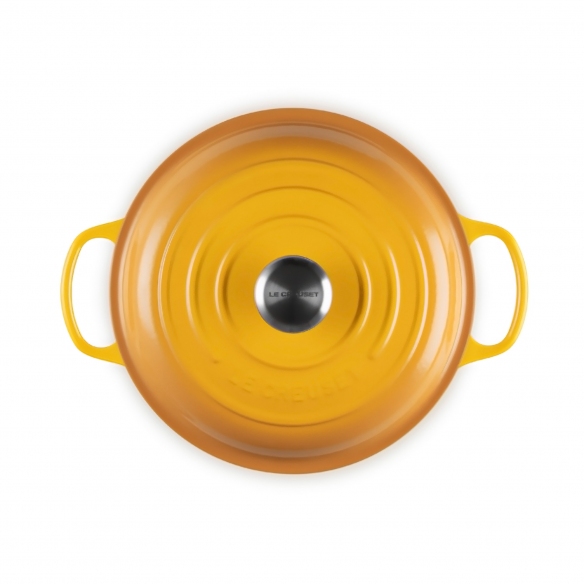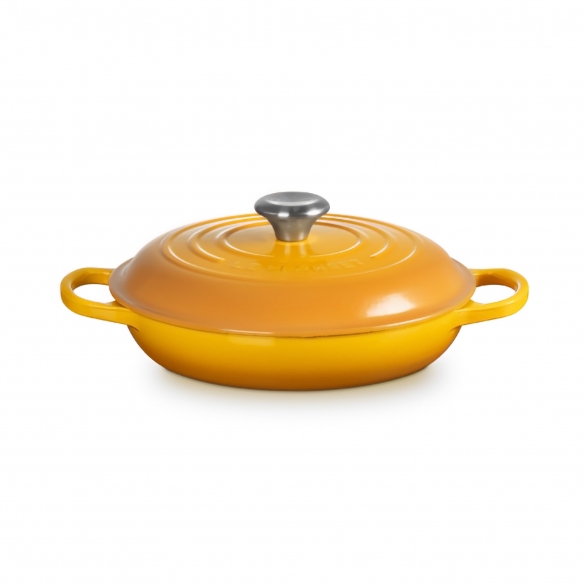 Tegame basso rotondo Evolution dal diametro di 26 cm realizzato in ghisa vetrificata smaltata sia all'esterno che all'interno. La forma schiacciata e lati poco profondi lo rendono perfetto per rosolare carne o verdure, per cuocere a fuoco lento o in forno. Questo tegame fa parte della ricca collezione in ghisa vetrificata realizzata da Le Creuset, diventata una leggenda nel mondo dell'arte culinaria. Ciò grazie proprio al materiale, la ghisa vetrificata appunto, che non solo è uno dei materiali più resistenti e duraturi, ma ti permette di ottenere pietanze di grande gusto, grazie all'uniforme distribuzione del calore! Disponibile nel colore shell pink, questo tegame dispone di due pratici manici che ti permettono di spostarlo in sicurezza e di un coperchio con pomolo in acciaio inox.