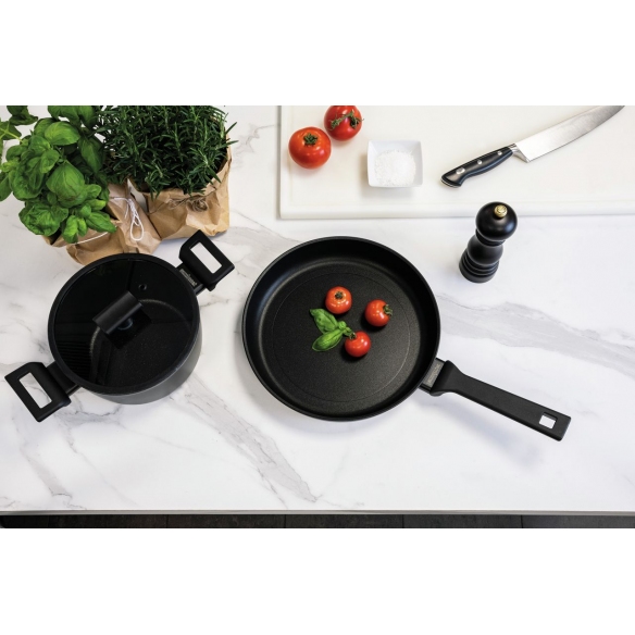 Padella Titan Pro diam. 24 cm in alluminio antiaderente con sistema a doppia induzione e rivestimento composto da due dischi in acciaio inox, uno strato in titanio con finitura in polvere diamantata e particelle minerali altamente resistenti, manico in bachelite e fondo ultrapiatto per offrire robustezza e stabilità durante l'uso e perfetta per una cottura rapida e uniforme di varie preparazioni culinarie con il vantaggio di avere una superficie antigraffio, antimacchia e resistente agli acidi naturali degli alimenti e adatta al lavaggio in lavastoviglie. Progettata e realizzata da Sambonet.