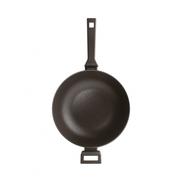 Wok Titan Pro diam. 30 cm in alluminio antiaderente con sistema a doppia induzione e rivestimento composto da due dischi in acciaio inox, uno strato in titanio con finitura in polvere diamantata e particelle minerali altamente resistenti, coperchio in vetro con sfiatatoio vapore e bordo in silicone, manici in bachelite e fondo ultrapiatto per offrire robustezza e stabilità durante l'uso e perfetta per una cottura rapida e uniforme di varie preparazioni culinarie con il vantaggio di avere una superficie antigraffio, antimacchia e resistente agli acidi naturali degli alimenti e adatta al lavaggio in lavastoviglie. Progettato e realizzato da Sambonet.