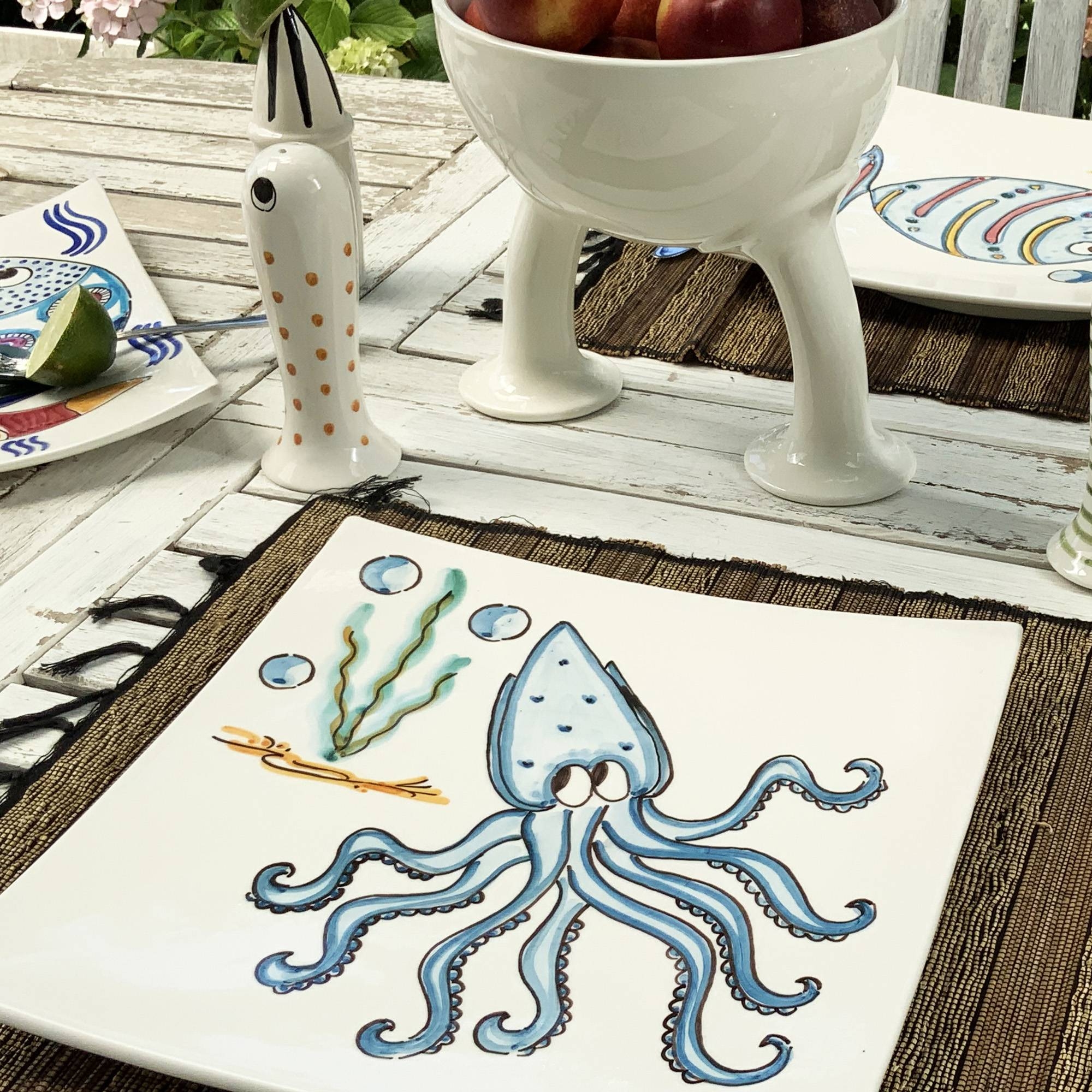 Il piatto polipo è realizzato in ceramica di Caltagirone, disegnato in Sicilia da Andea Branciforti per Improntabarre. Ogni piatto è realizzato artigianalmente con la tecnica della fusione e della colata e presenta un diverso pesce stilizzato. Mescola e abbina questi divertenti piatti, scegliendo i tuoi preferiti per creare il tuo set unico qui, su Newpop.it!