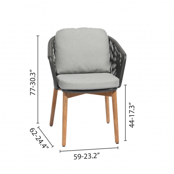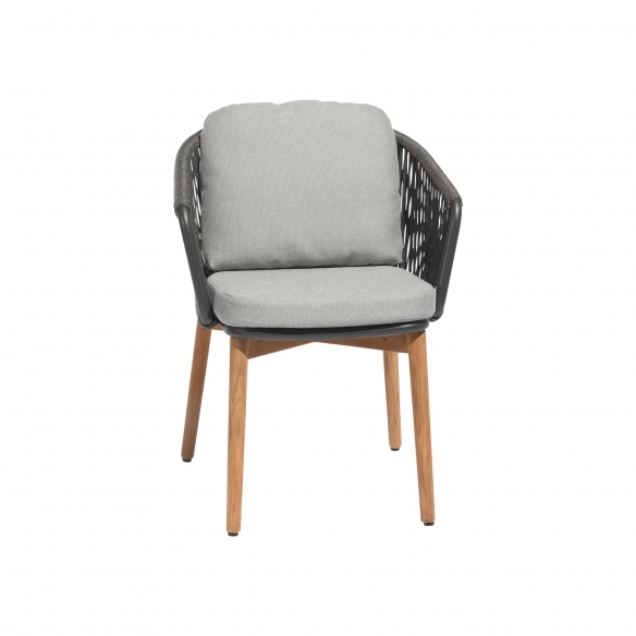 La poltrona da pranzo Newport, con cuscini inclusi, ha una struttura resistente in alluminio, con corde intrecciate e legno Teak che insieme creano un'atmosfera calda ed elegante per qualsiasi ambiente, sia in contesti di design contemporaneo, che in ambienti esterni tradizionali, senza perdere l'identità raffinata. La poltrona da pranzo Newport è personalizzabile in quattro bellissime finiture e colorazioni, permettendo di trovare il giusto equilibrio con lo stile della tua casa. I morbidissimi cuscini sono realizzati per esterni, in grado di resistere ai raggi UV e ai diversi agenti atmosferici come caldo e umidità. Inoltre, i cuscini della poltrona da pranzo Newport sono facilmente removibili per la manutenzione e la cura. La poltrona da pranzo si impone come soluzione ottimale per chi cerca un pezzo di arredo in grado di fondere eleganza dei materiali e resistenza per affrontare la vita all'aperto, senza rinunciare al relax assoluto. Perditi nel comfort profondo e invitante della poltrona da pranzo Newport con cuscini integrati, un classico senza tempo che regala all'ambiente un oasi di pace e di benessere.