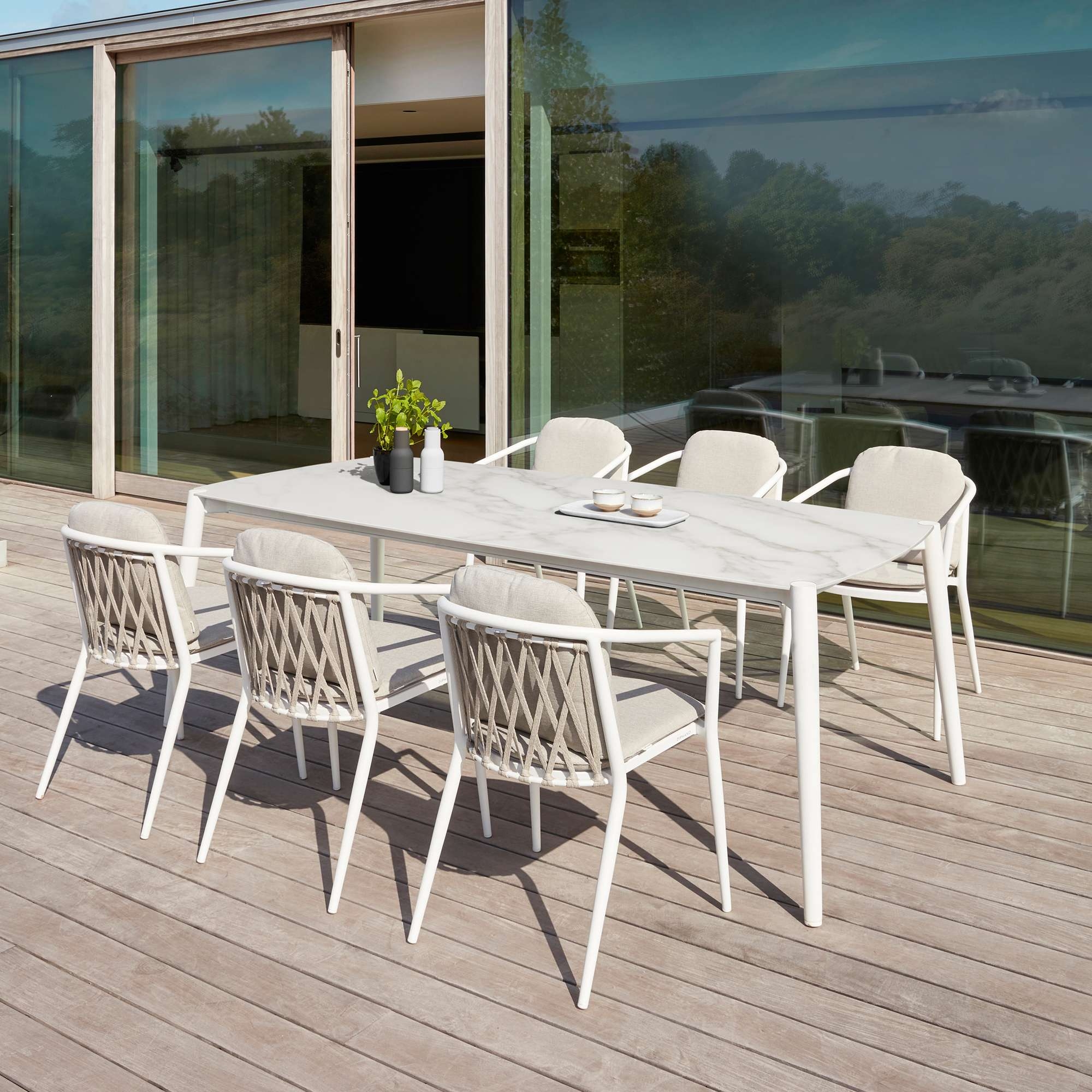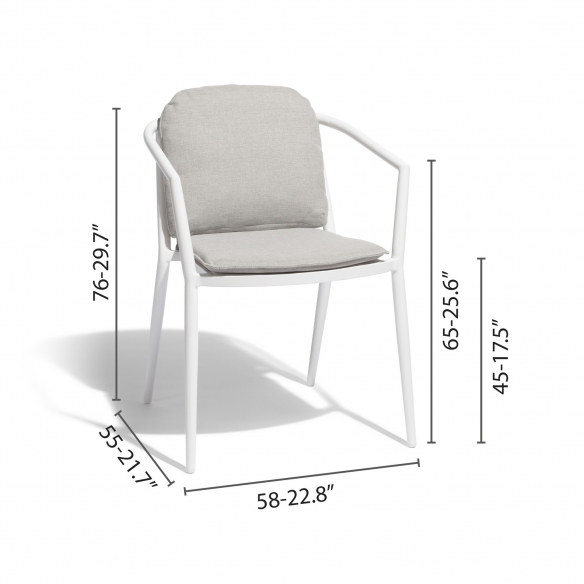 La poltrona da pranzo Diamond ha una struttura in alluminio di altissima qualità, realizzato per resistere agli agenti atmosferici esterni, come caldo e umidità, e garantendo una lunga durabilità e bellezza invariata nel tempo. La poltrona da pranzo Diamond outdoor è disponibile in quattro splendide colorazioni; ciò la rende versatile per qualsiasi tipo di esterno, che sia una piccola terrazza, un ampio giardino o un balconcino. Questa elegante poltrona da pranzo per esterni è il frutto dell'innovazione nel campo dell'arredamento outdoor, abbinando funzionalità ed estetica. Il motivo della finitura in corde trasforma questa poltrona da pranzo in un vero e proprio gioiello con un look aggraziato. I braccioli di questo meraviglioso gioiello sono stati progettati per rendere Diamond un'oasi di comfort e per offrire il massimo supporto e relax. Diamond è l'apoteosi dell'arredamento che definisce lo stile leggero e giocoso di questa collezione. Scegliere questa poltrona da pranzo outdoor significa abbracciare un'estetica lussuosa e un comfort senza tempo per il tuo terrazzo, trasformandolo in un angolo di paradiso personale.