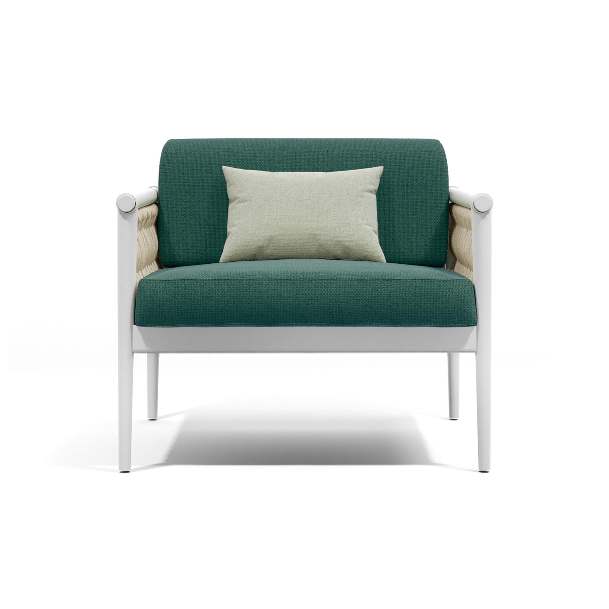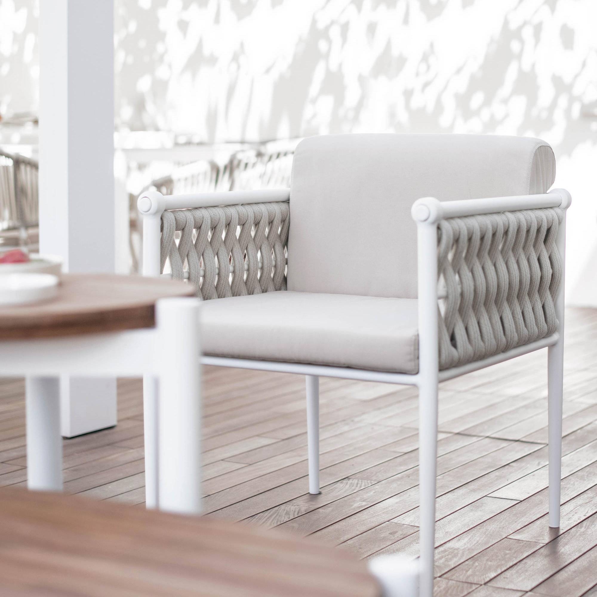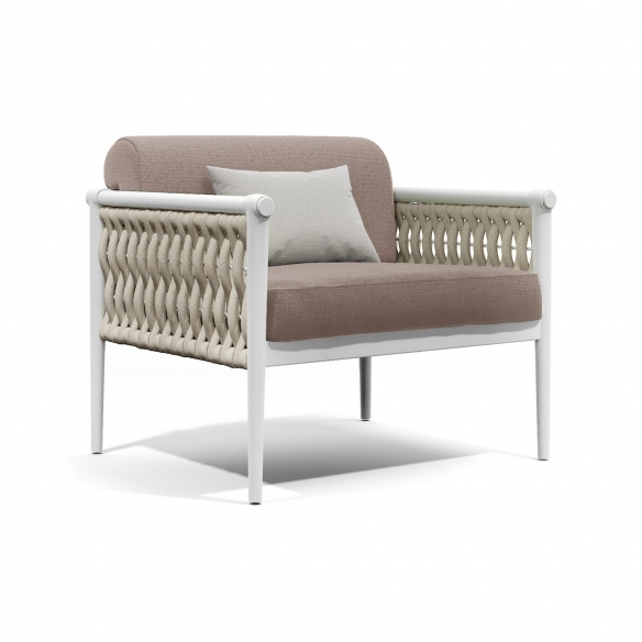 Poltrona da esterno Dandy 2.0 realizzata con strtuttura in alluminio, pannelli laterali in corda nautica e cuscini della seduta e dello schienale rivestiti in tessuto outdoor. Disponibile in varie combinazioni di colori e tessuti, la poltrona outdoor Dandy 2.0 è un capolavoro di design che trascende l'ordinario, combinando funzionalità e un'estetica sofisticata. Come il nodo di una cravatta che simboleggia eleganza e distintività, la poltrona Dandy incarna questo concetto con una struttura in alluminio leggera ma resistente, abilmente intrecciata con morbide corde che aggiungono un tocco di charme e confortevolezza. Questa seduta non è solo una componente d'arredo: è una dichiarazione di stile e culla di relax, perfetta per dare una nuova vita a spazi esterni come giardini, terrazze o portici. Scegli la poltrona Dandy 2.0 per creare un angolo di puro piacere visivo e fisico, dove ogni momento di pausa si trasforma in un'esperienza di lusso all'insegna del riposo e del buon gusto. Disegnata da Atmosphera Creative Lab.